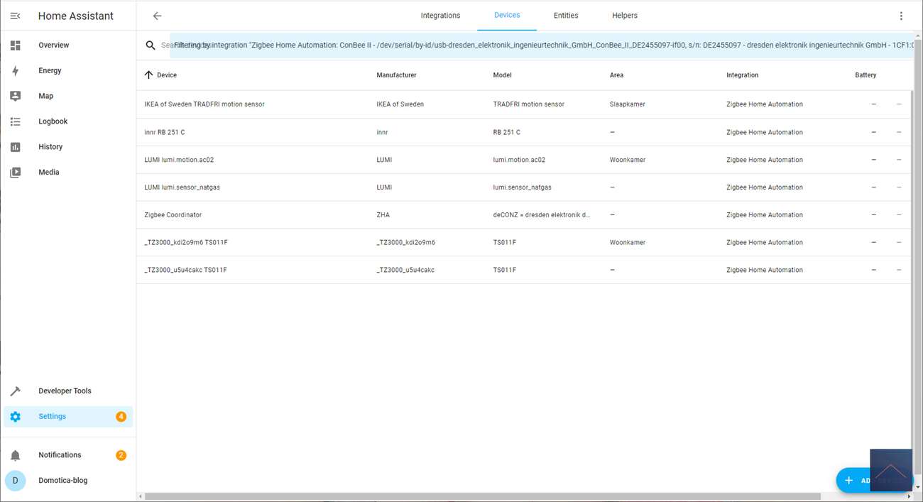 Now we can start adding the plug by letting the Conbee find it. To find it, we go to the Conbee stick (with your integrations) and click on devices. Now we plug the intermediate plug into the socket and click on "add device" to start the search.