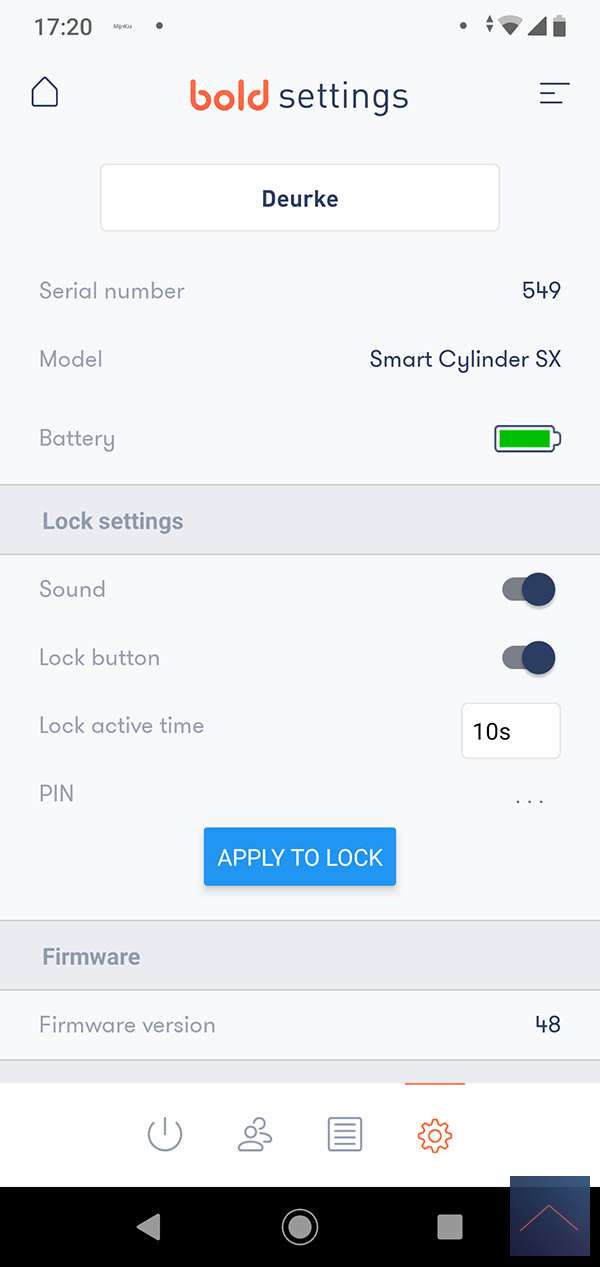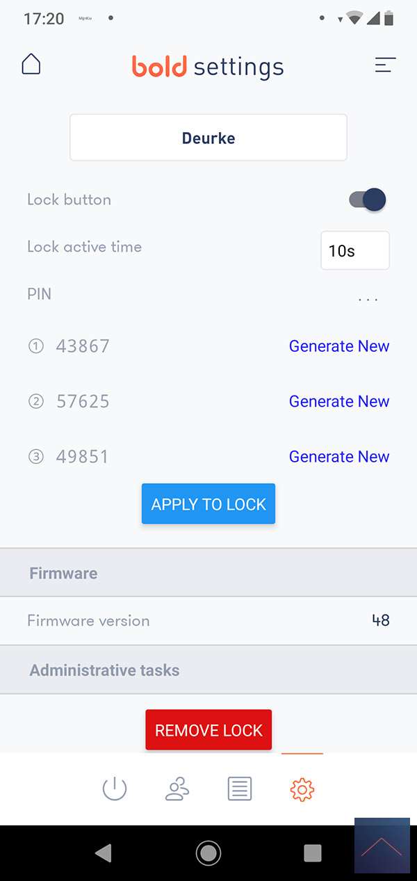 You can reach the settings via the radar icon. Here you can see the battery status, turn the sound on and off, turn the inside button on or off and set the time that the lock is active. Here you can also provide the lock with a new firmware. In my case, there was new firmware, but I didn't get it installed. After a few tries, he took it.