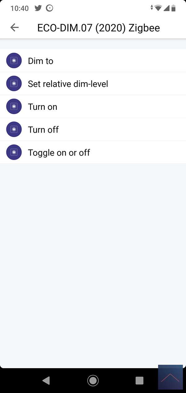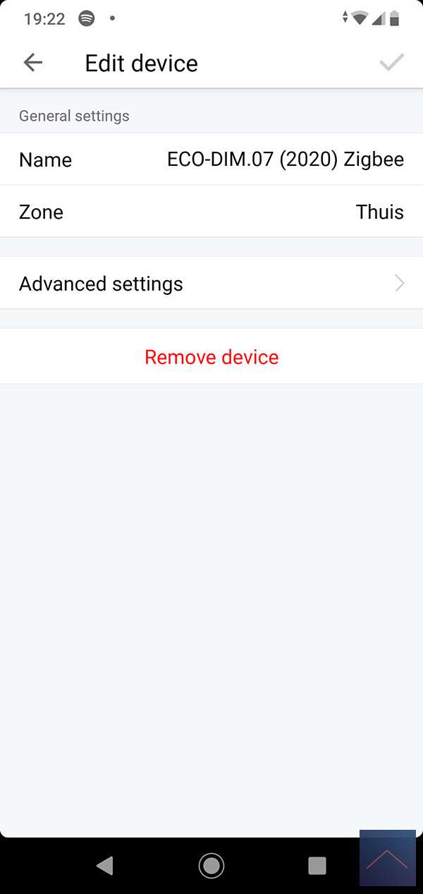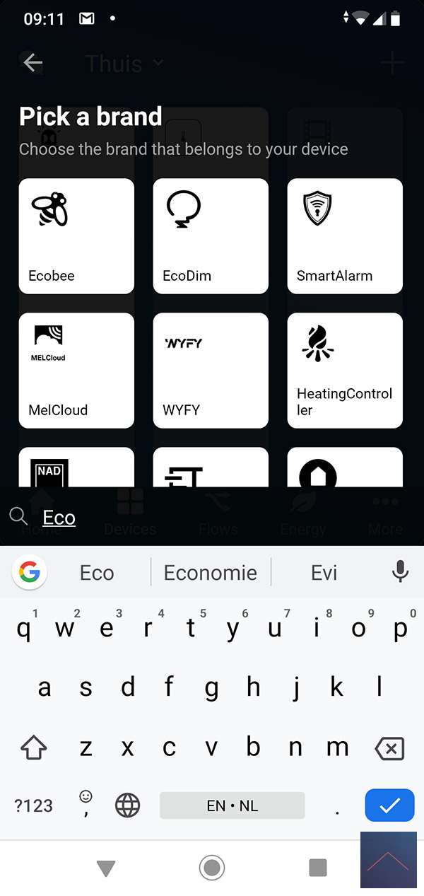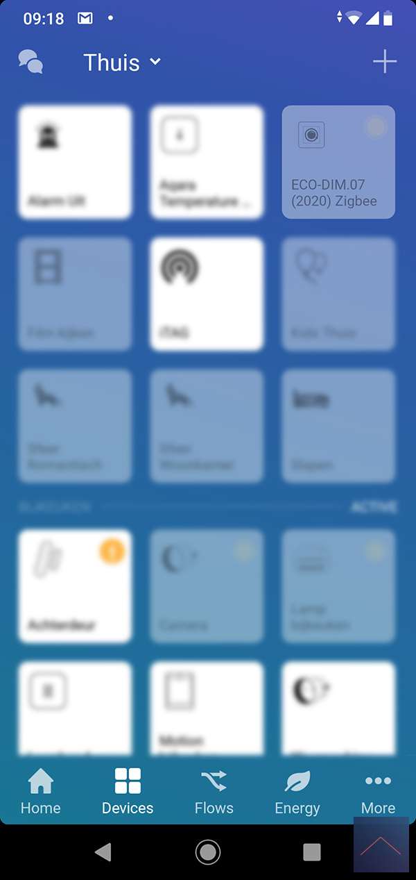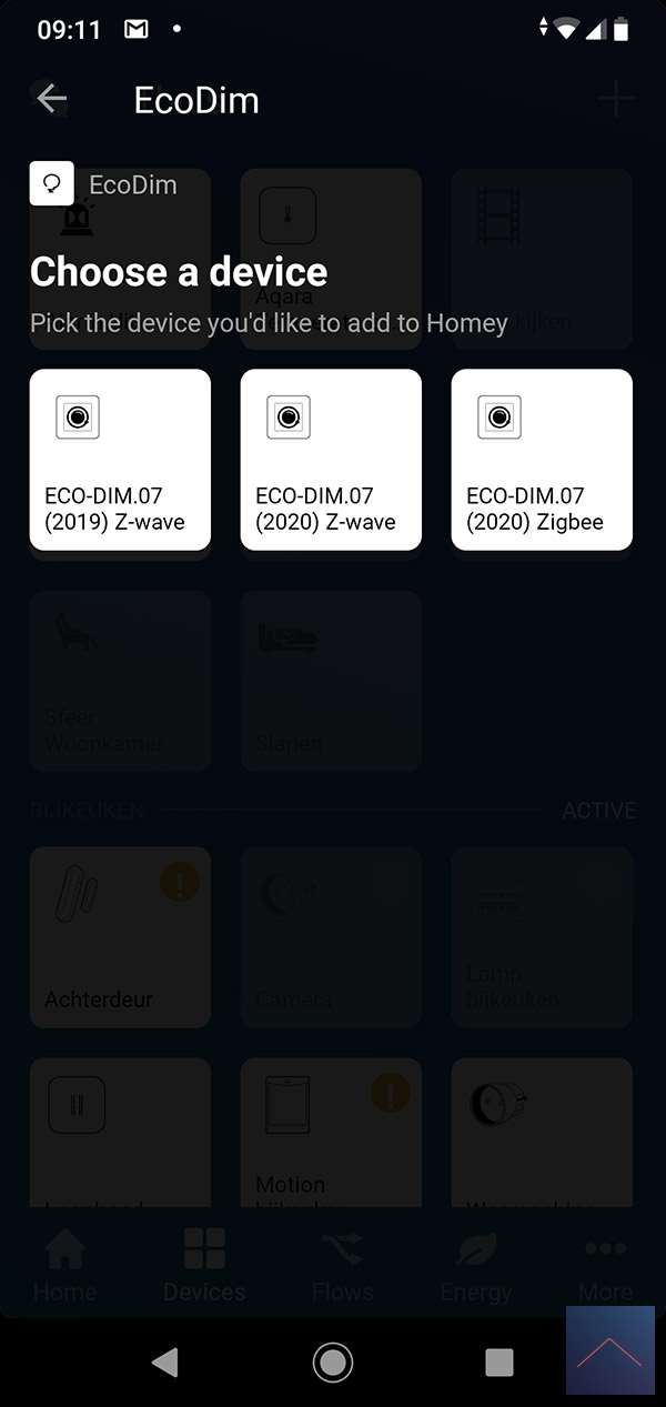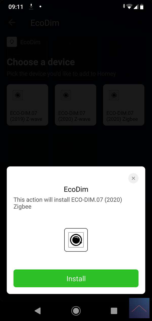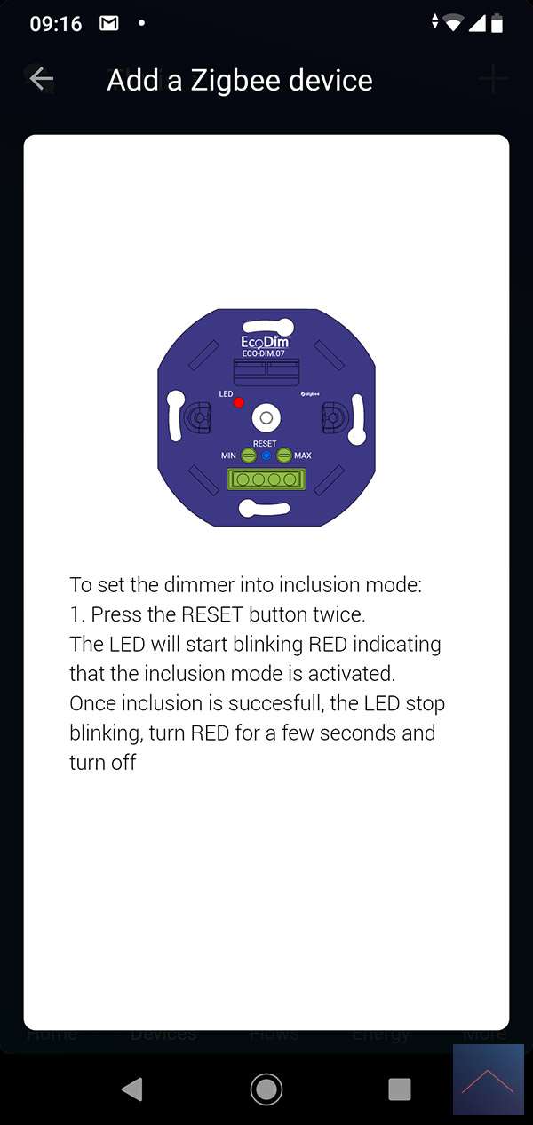 After this, wait a while before turning the power back on. Then start the Homey APP and go to your devices and tap the plus. Then search for "Eco dim" and install the APP (if you don't have it yet). Then press ECO-Zigbee 2020 and the installation will start. Then supply the dimmer with power and if the LED lights up blue you can press the reset button 2x in succession. You can find this under the dial. If the LED lights up red, you have to reset it. You do this by pressing the reset button for 5 seconds. After this, press the reset button 2x again to start adding. The LED will no longer flash but will take on a solid blue color.