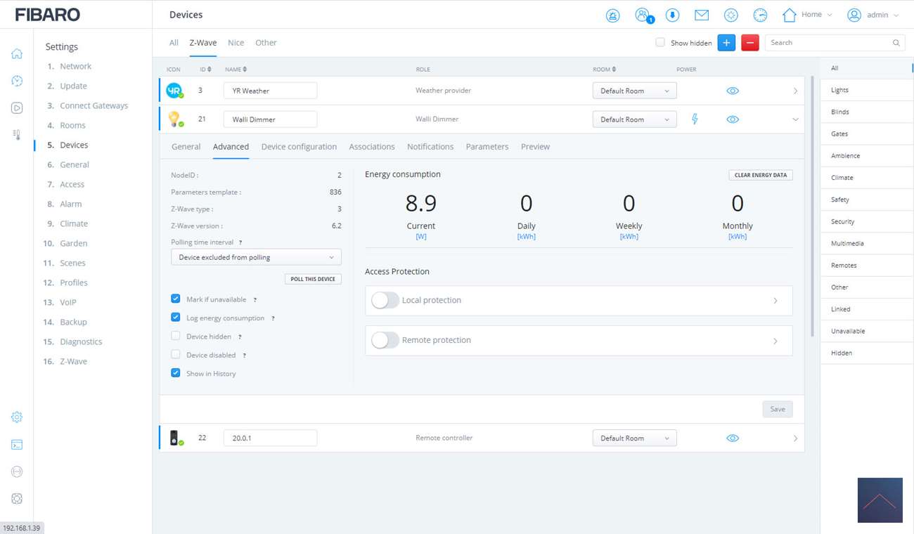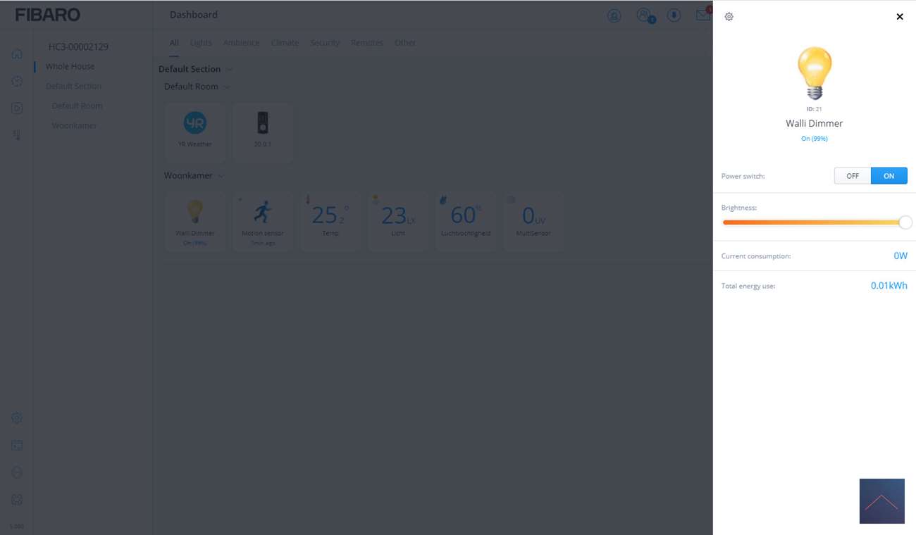 Now that we have added it, the connected lamp can be operated via the switch as well as via the HC3. The status is kept in both places. We can switch the lamp on and off, dim it and see the energy consumption.