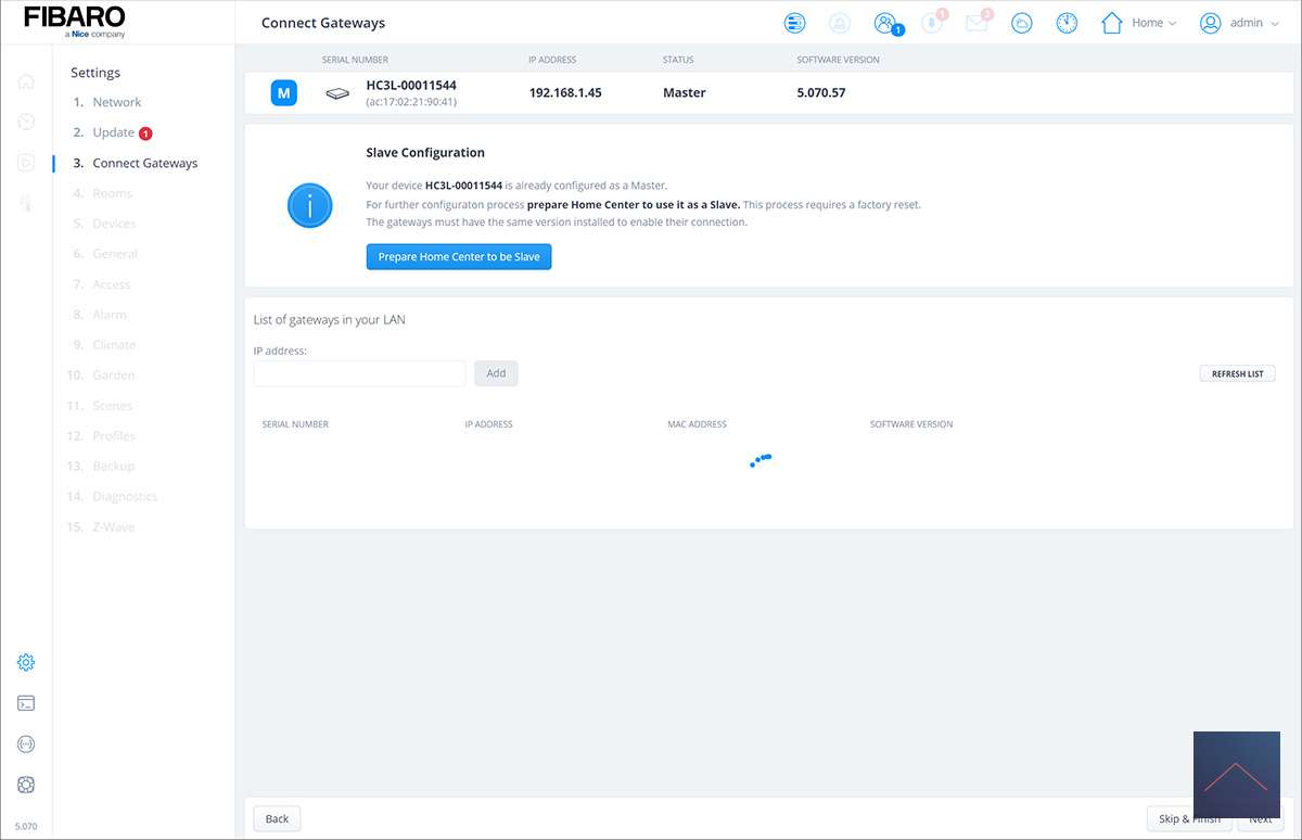 After I clicked on "next" the HC3 Lite will check if there are more gateways in my network. You can link these together to build a large network. You can use the HC3 Lite as a slave (extender). Very nice if you have a large house or a garden house that is further away from your house. In our case this is not the case and we proceed to the next screen.