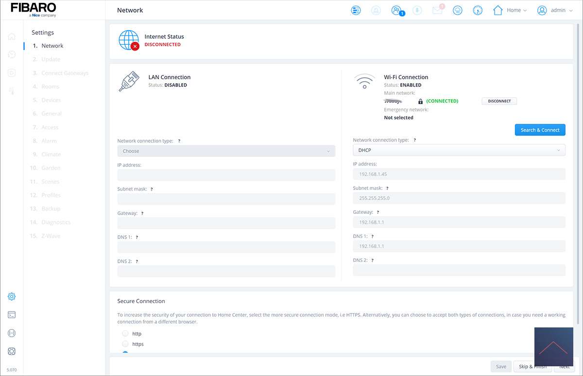 To get started with the HC3 Lite, we must first install it. The first step is to power the hub through the power supply. the supplied adaptor. After connecting, the LED will flash on the front of the hub, and then (please wait) will light up red. This means it is ready to be configured. The HC3 lite works via WiFi so the next step is to make sure it is connected to your own network. He does this by opening a WiFi hotspot. So you have to connect your computer to this hotspot. So make sure you have a laptop/computer with a WiFi connection. During the installation you will be asked for the WiFi password of the HC3 Lite, which you can find at the bottom of the hub. Once connected, use your browser to go to find.fibaro.com to find the hub. In my case, it couldn't find it, so I went to the local address and it's 10.42.0.1. He did find him this way. Now we log in with: Login name: admin Password: admin You can change this later. Even more strongly, it is actually recommended that you change this one, as this is a rather obvious combination. By the way, these are your local login details. You can also use it externally, more on this later.