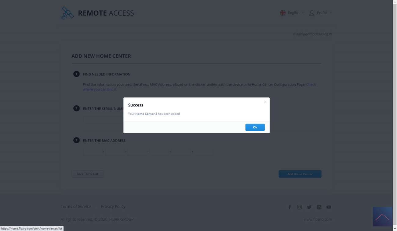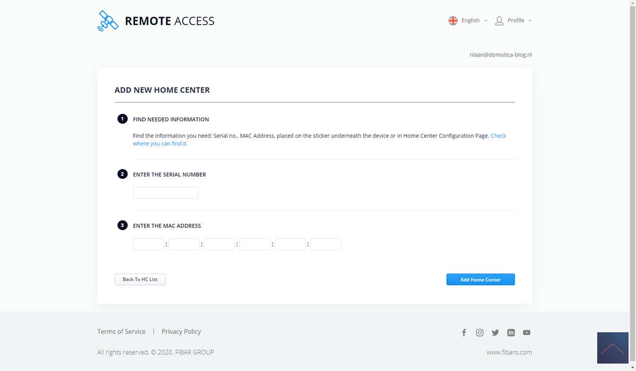 To make this possible you have to create a Fibaro ID. To do this, you must follow the steps during registration. Good to know is that you can find the serial number and MAC address on the bottom of the HC3.