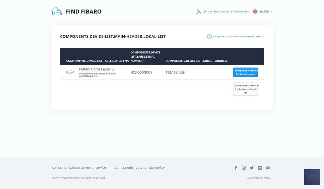 Now that we have power and a network we have to configure the HC3. You can do this by going to find.fibaro.com. Here is a tool that will scan your network for the HC3. If you have several (or older) Fibaro gateways, it will find them too. We can then select the correct one to start the configuration.
