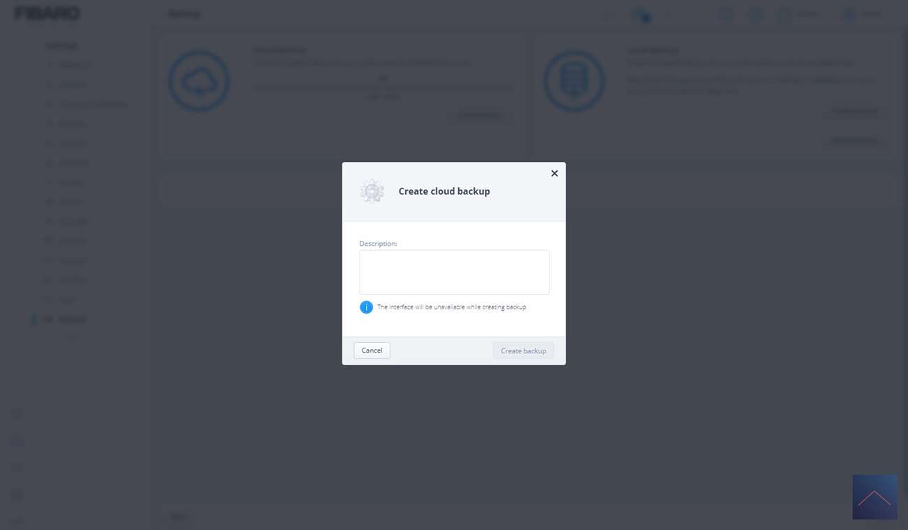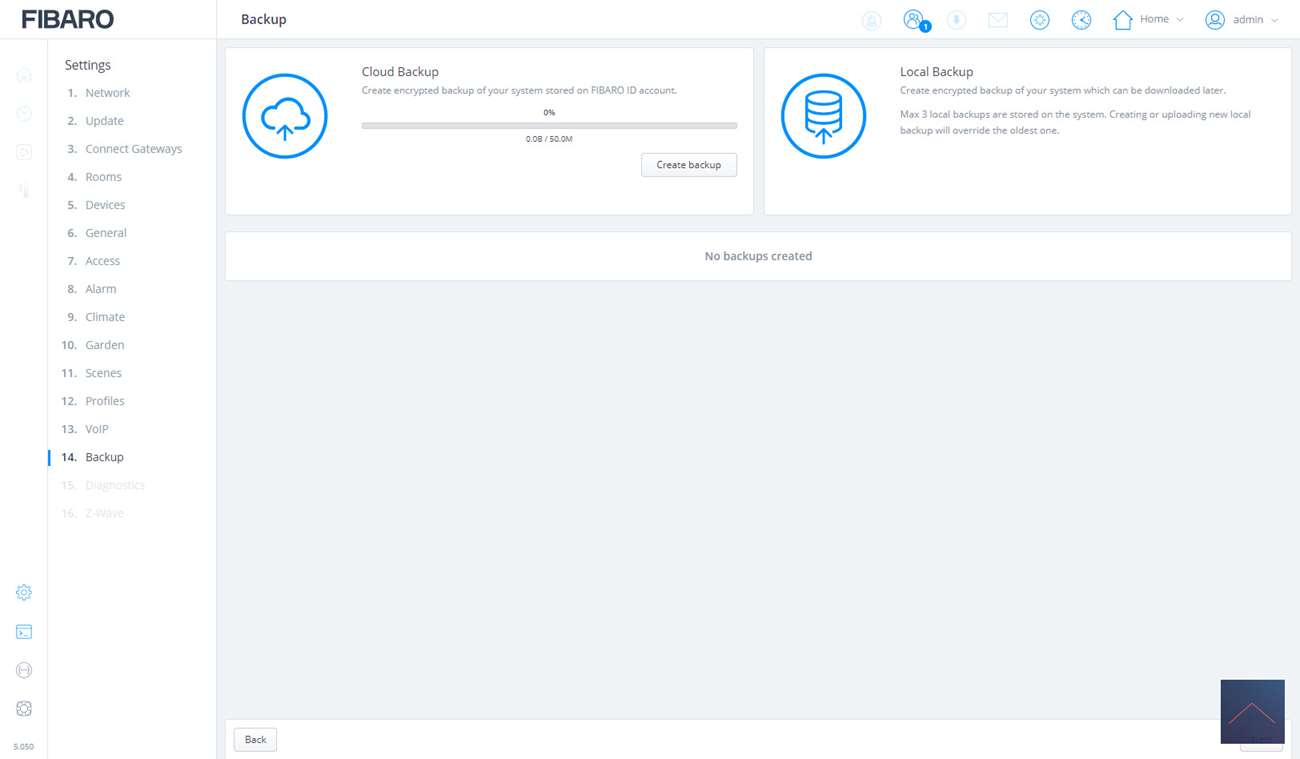 We have almost arrived at the final steps. The next part are backups, something that should of course not be missing in a Smart Home system. Cloud backups and local backups can be made. Where the first 50mb of disk space is available and a maximum of 3 versions are saved with the last.