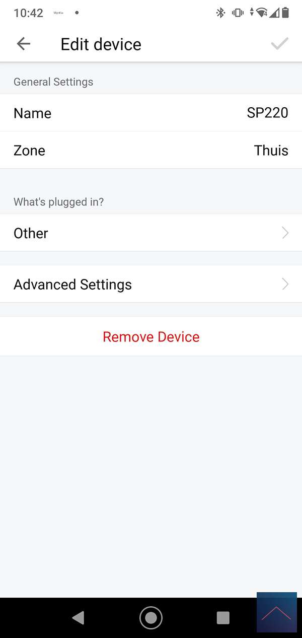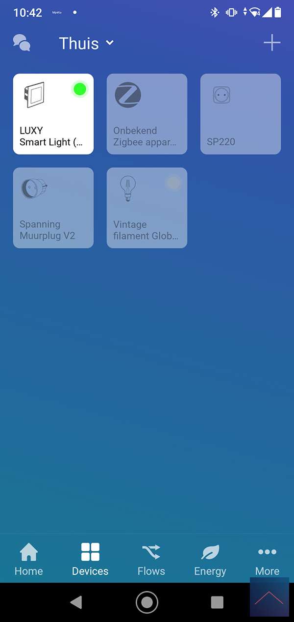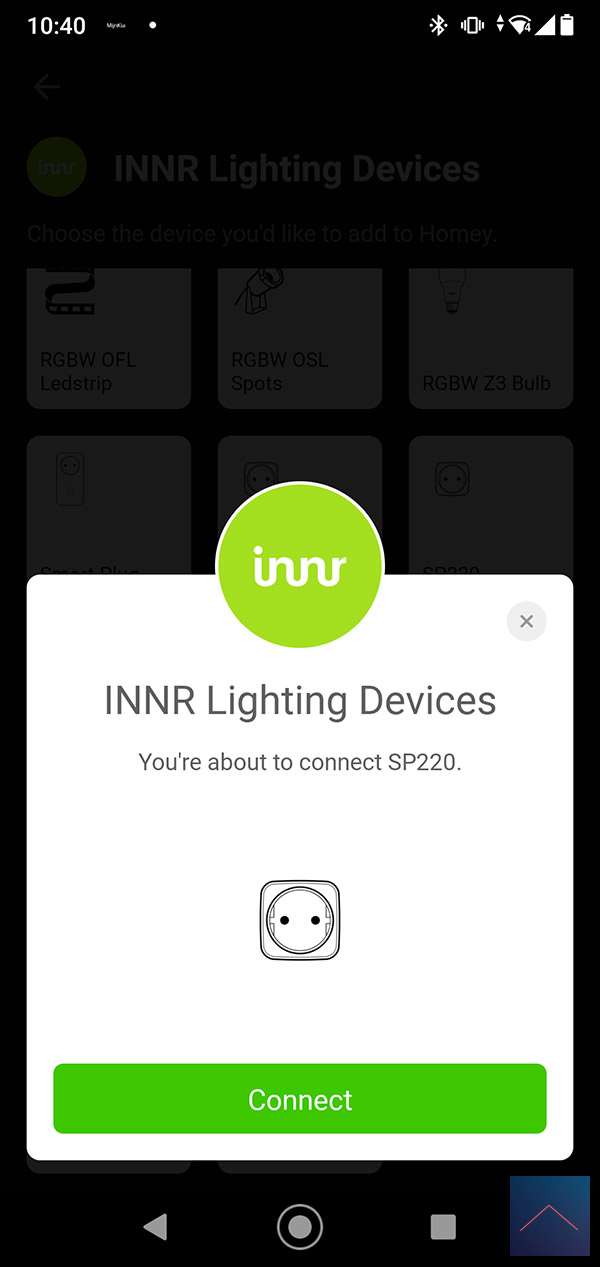 We log in to the Homey first and go to my devices. We then press the plus sign and find the SP-220. Now we supply it with power and keep the button on the front pressed for 5 seconds. The LED on the top will now flash red and then green to indicate it has been added. This is also the case because I see in the Homey that it has been found.