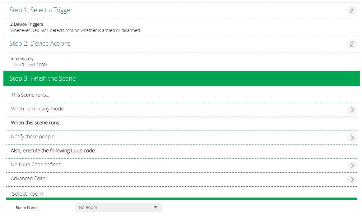 The motion detector is found as an on/off switch. We can change this by going to the device configuration. Enter the following values: