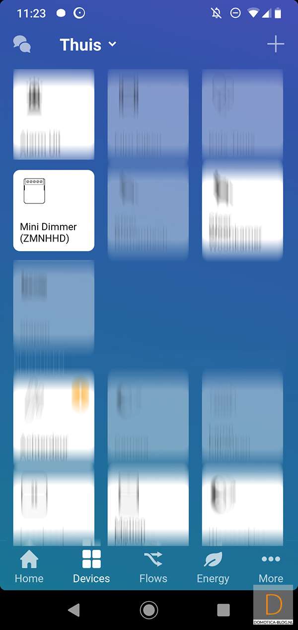 The first step is to connect the module. As already mentioned you can connect it with 2 or 3 wires. If you have the option to connect it with 3 wires (with blue (NULL) wire) I would go for this option. Because then most lamps work better. Make sure you get the power where you are going to work and connect the dimmer according to the supplied diagram. Wait a while before turning the power back on. It is better to first start the Homey APP and go to your devices. You then click on the plus sign and look for the dimmer. Then install the APP if you did not already have it and provide the dimmer with power. In my case, he was found immediately. The dimmer indicates that the addition has started when the LED lights up blue. It will then light up red and then green.