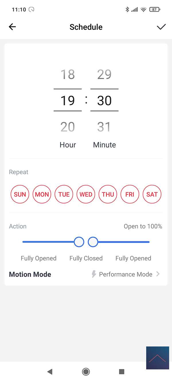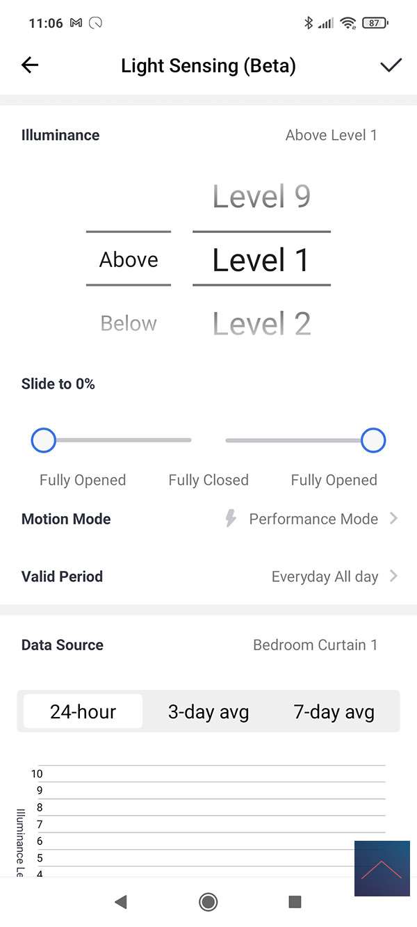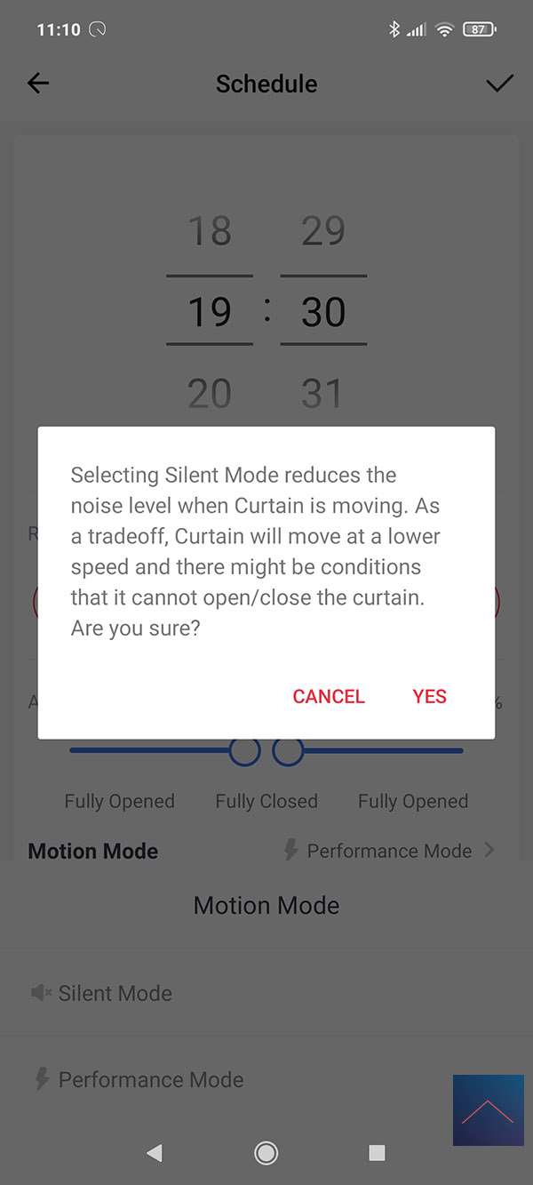 In addition to operating on light, you can also use a schedule. You can select a time and day of the week and indicate whether the curtains should be open or closed. There is also a possibility to, for example, open the curtains half way. If you want the SwitchBot to make less noise, you can choose a "silent mode", then opening it will make less noise, but it will also be slower.