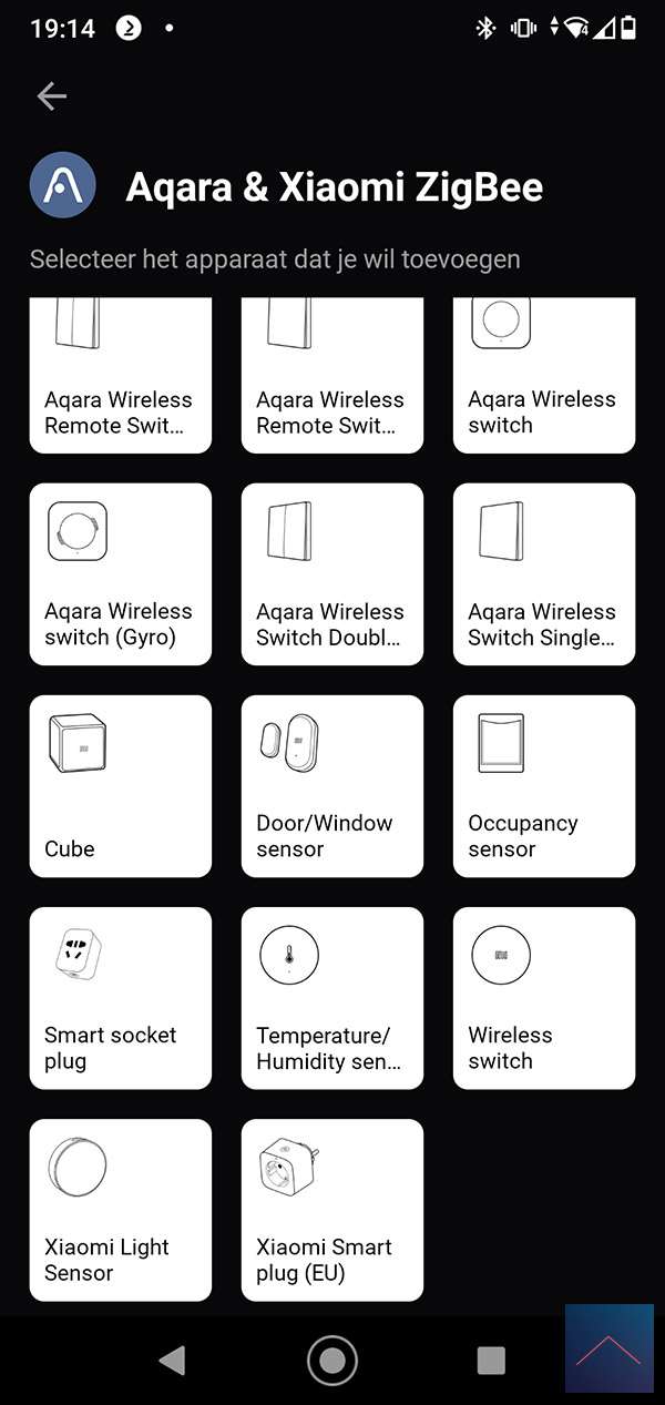 We start by logging into the APP and going to our devices. Then we press the plus sign and look for the Xiaomi plug. Various APPs are found so it is not entirely clear which one you should have but you can use the "Aqara and Xiaomi". If you have selected this one, you have to scroll down a bit. If we press through, the APP asks to reset the plug. You can do this by holding the button at the top for 5 seconds. The LED will flash red and then blue. I see that he is indeed found by the Homey.