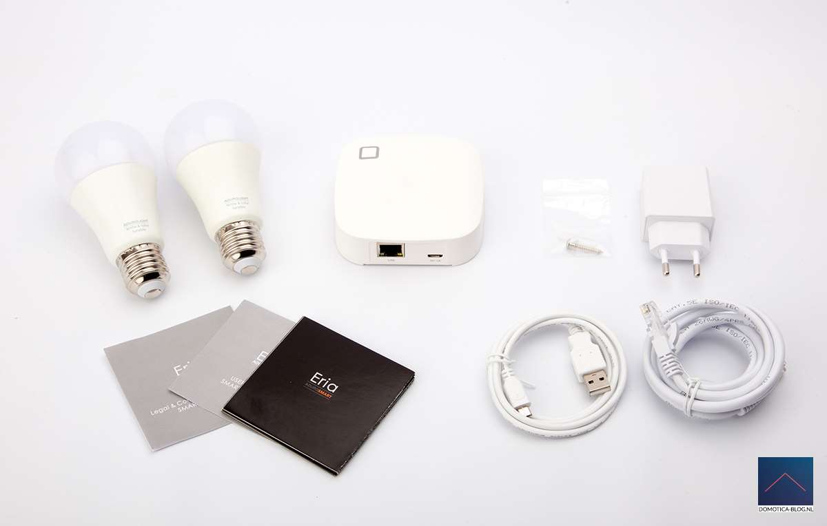 The starter package "ERIA Colors and White Start Kit A19 60W A19" contains the controller and two lamps and an instruction manual. The "ERIA Smart Motion Sensor" contains the motion sensor and an instruction manual, unfortunately it lacks here the two AAA batteries that the sensor needs.The site states that they are present, so maybe we have received a previously tested version.