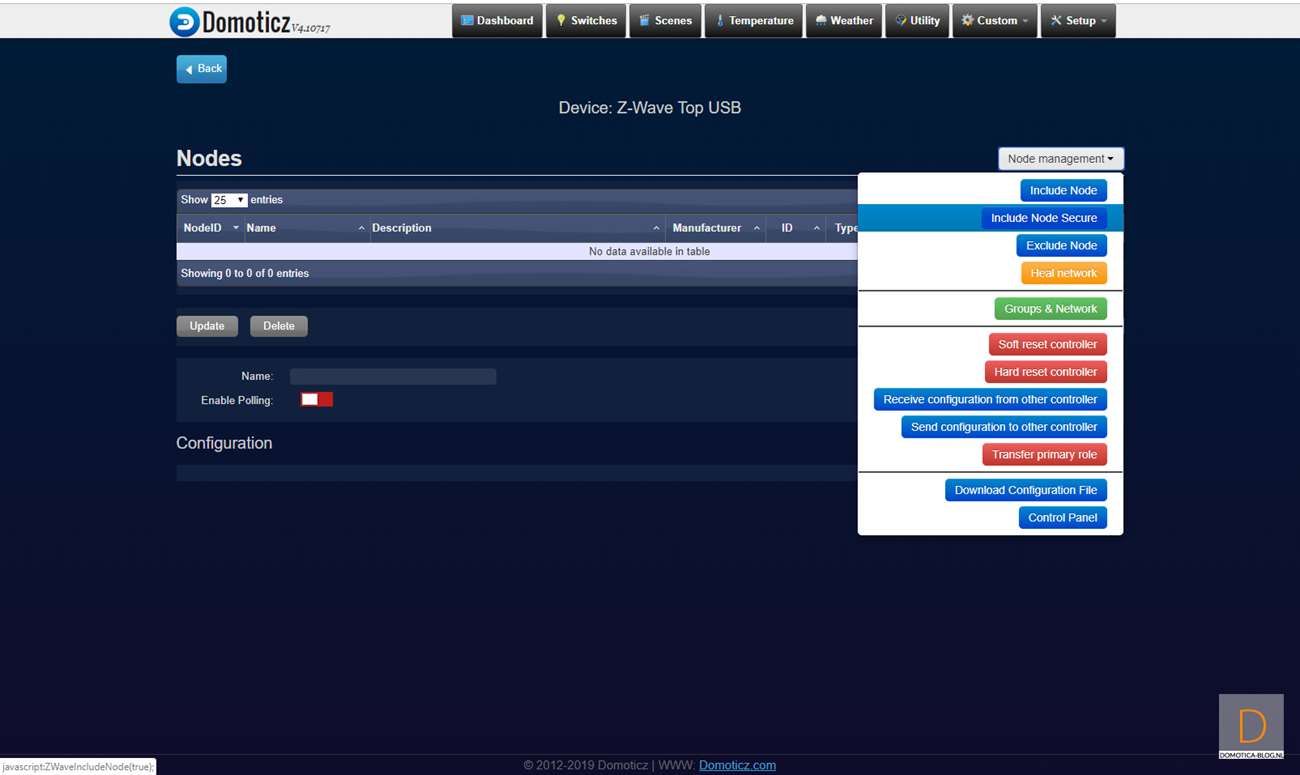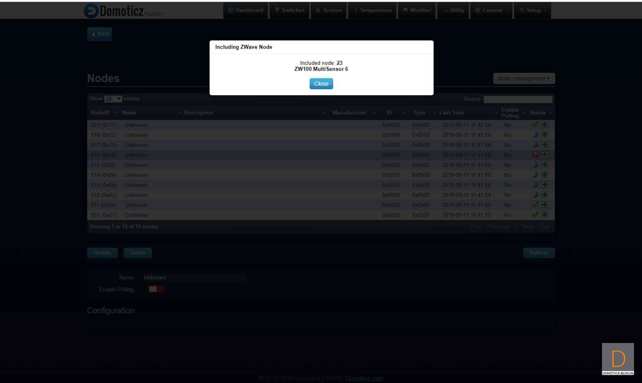 You can add the Multisensor 6 by going to Setup and hardware. I add it via the Aeon Labs Z-Wave USB stick. So I click on setup there. Then I go to the right side and click on "include node secure" in the menu. Then press the button on the inside of the sensor. The LED on the front will flash green and then yellow, to indicate that the addition was successful.
