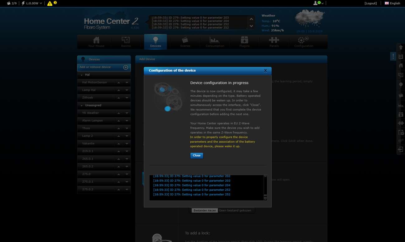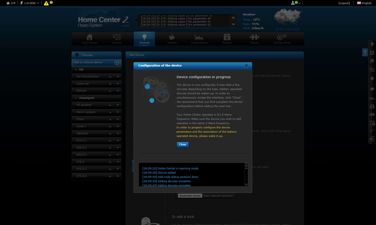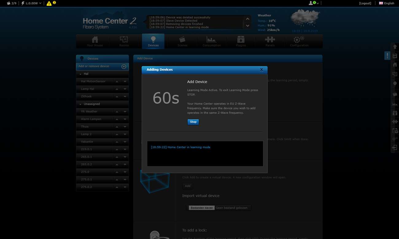 After this, log in to the HC2 and go to your devices. Then click on "add device" and press 1x on the button on the back of the sensor. The LED on the front will flash green and then yellow to indicate that the addition has started.