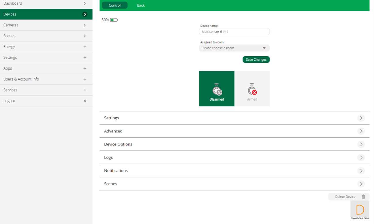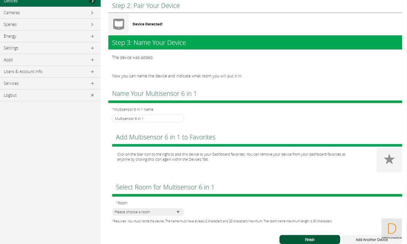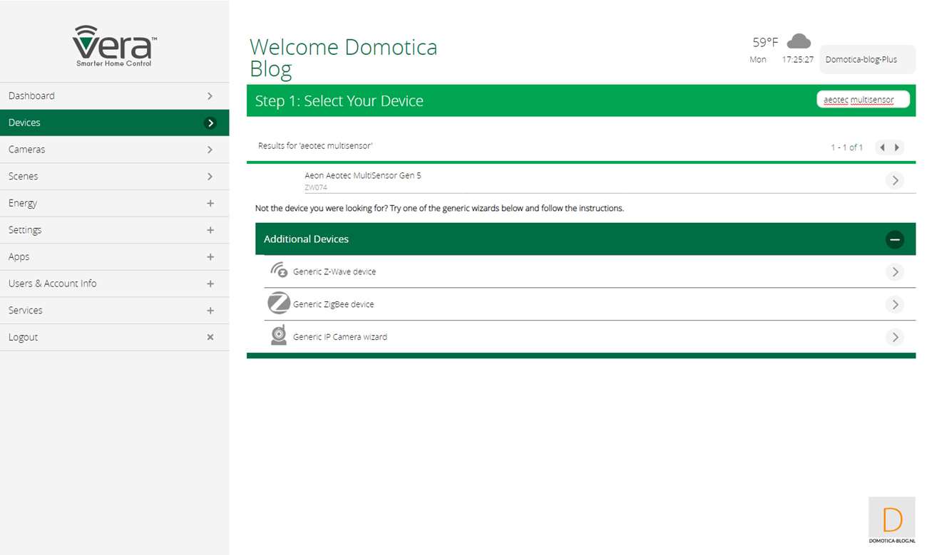 Then log in to the Vera and go to your devices. Then click on "add new device" and search for the Multisensor 6. For a change I see him in the list and I start adding. Then I press the add button on the sensor. The sensor was found immediately and see the LED on the front flashing green and then flashing yellow to indicate that the addition was successful.