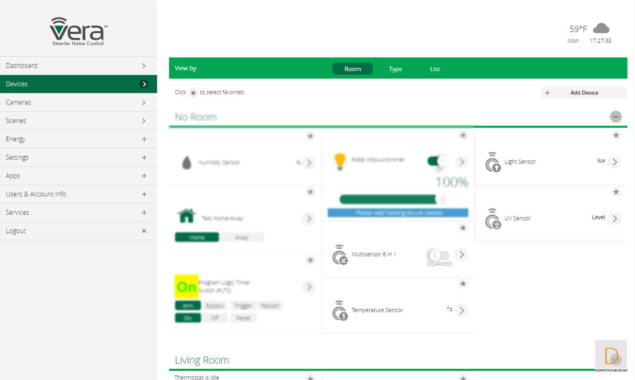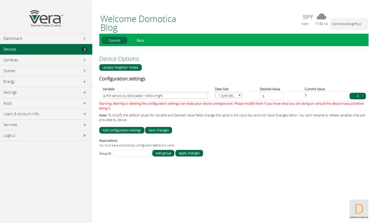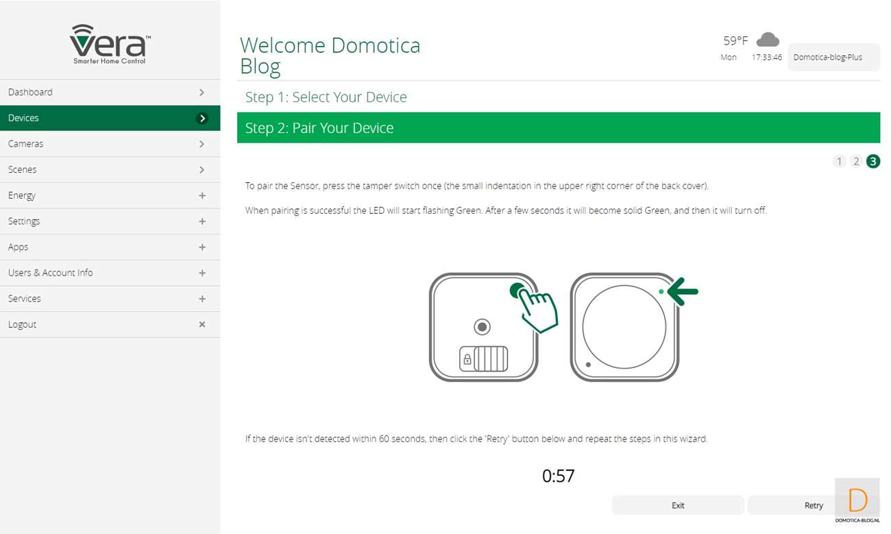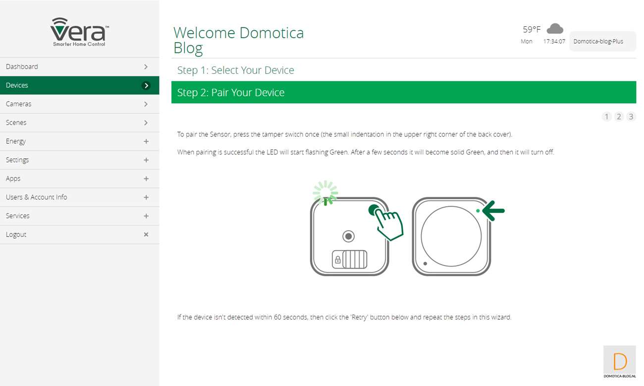 Then log in to the Vera and go to your devices. Then click on "add new device" and search for the Multisensor 6. For a change I see him in the list and I start adding. Then I press the add button on the sensor. The sensor was found immediately and see the LED on the front flashing green and then flashing yellow to indicate that the addition was successful.