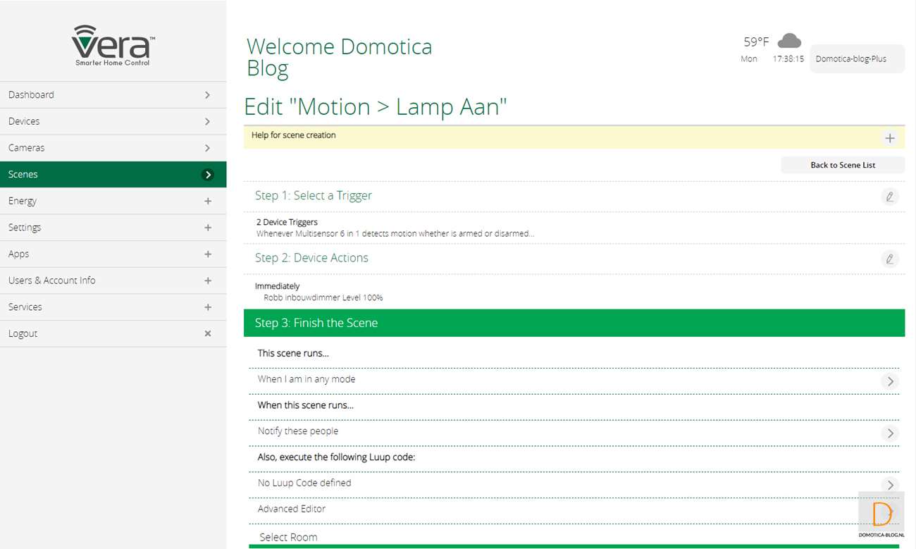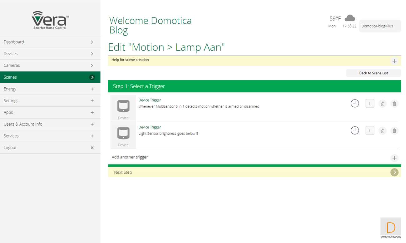 In the example below we use both the motion sensor and the lux sensor of the Aeotec. Because if there is movement and the lux is lower than 5, we want the lamp in the hall to be switched on.