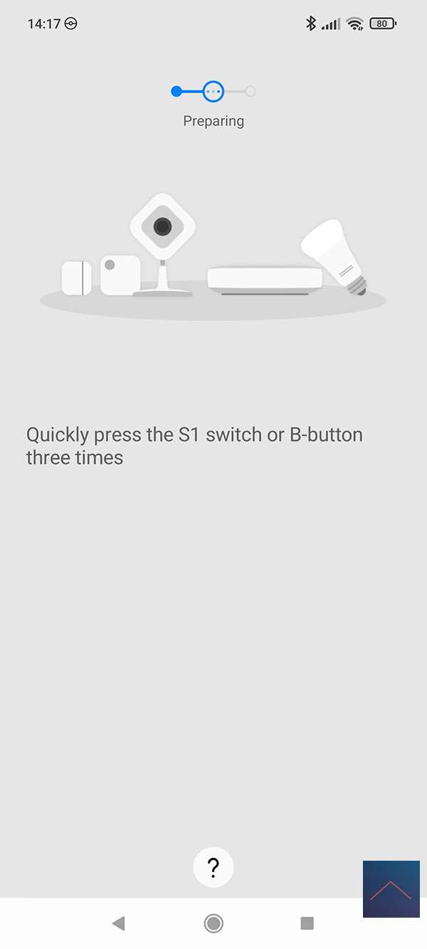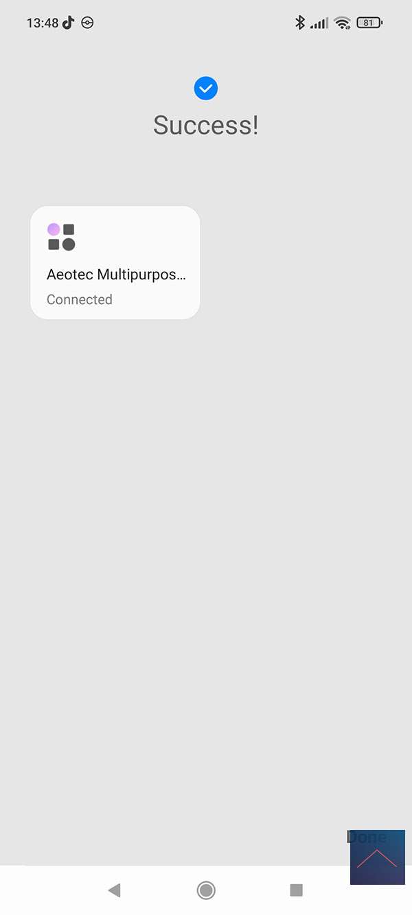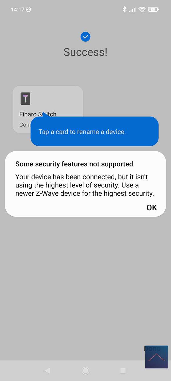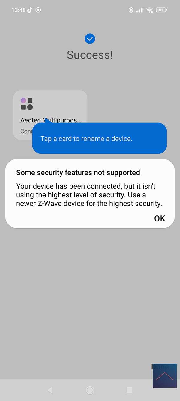Now we need to put the sensor in learning mode. You can do this by pressing the button on the back 3 times in quick succession. We see the LED of the sensor turn yellow, indicating that it is learning/being added. After a few seconds we see it appear in the APP and a message appears that it is not optimally secured.