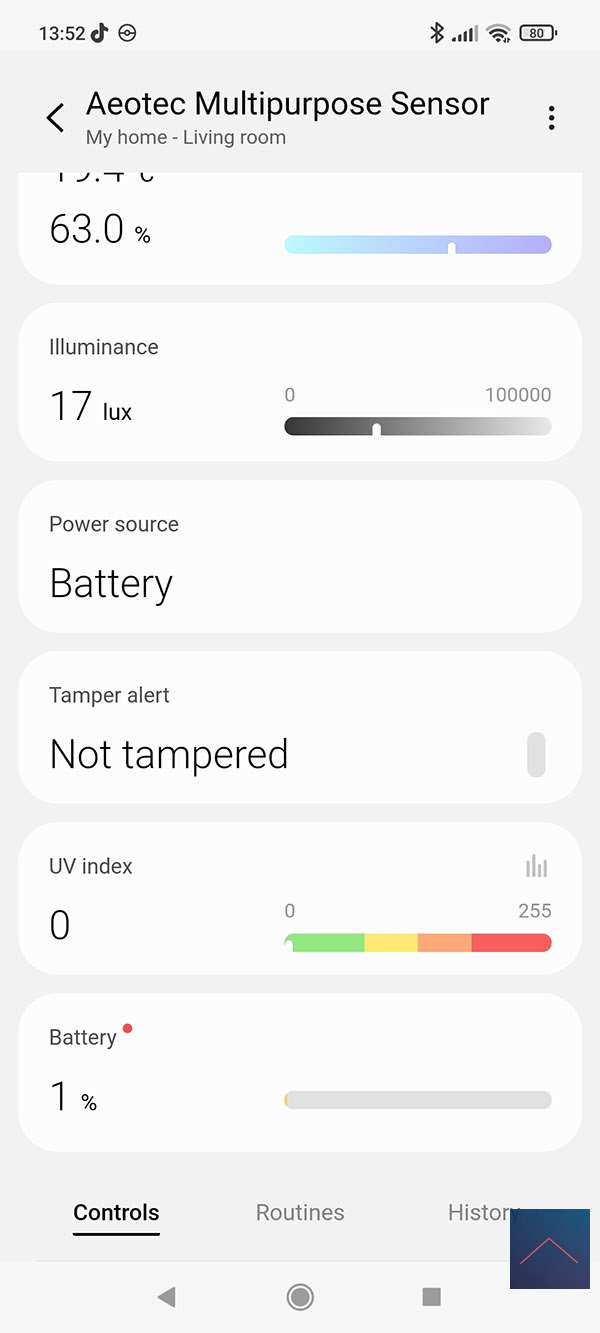 It also takes a while until he appears in my room and we see the movement come in. If we look at the details of the sensor, we also see the temperature, lux value, humidity, UV value and battery level.