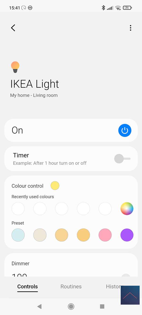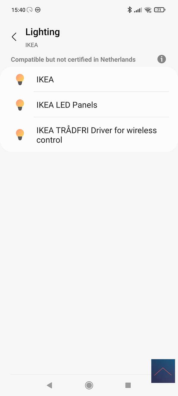 We then start the APP again and click on the plus sign and search for Ikea, then press Lighting and then Ikea. Now we have to turn the lamp on/off 6x to put it into learning mode. The lamp gives a short flash that this was successful and after a few seconds I see it also appear in the APP.