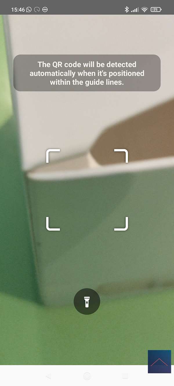 We will also add these again by pressing the plus sign. We use the scanner this time because we see a QR code on the inside of the box. We scan the code and put the plug in the socket. It is not found after a long time of waiting, so we reset it by pressing and holding the button on the top until the LED lights up. After that, the LED will start flashing blue and it will be found by the APP.