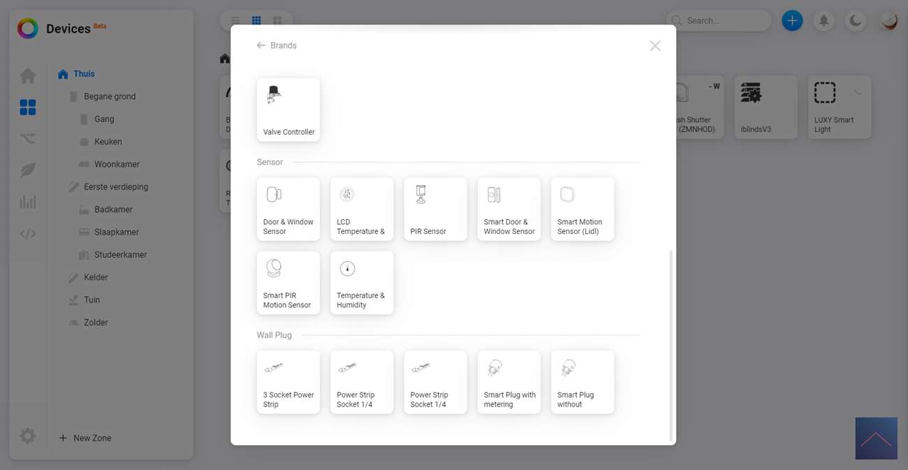 The first controller that we will connect the BlitzWolf to is the Homey. The Homey has a Zigbee chip built in so pairing shouldn't cause too many problems. We start by logging in through the web interface and going to our devices. We then click on the plus sign and press 'add new device'. Now we look up the BlitzWolf, you see that there are results, but the BlitzWolf brand does not come up. This is because there is no separate APP but you can use the Tuya Zigbee APP. We select this and look for the plug (with meter).