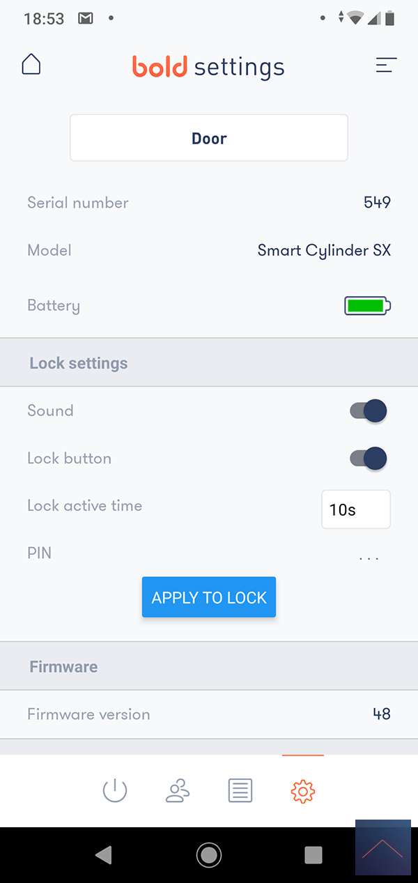 You can reach the settings via the radar icon. Here you can see the battery status, turn the sound on and off, turn the inside button on or off and set the time that the lock is active. Here you can also provide the lock with a new firmware. In my case, there was new firmware, but I didn't get it installed. After a few tries, he took it.