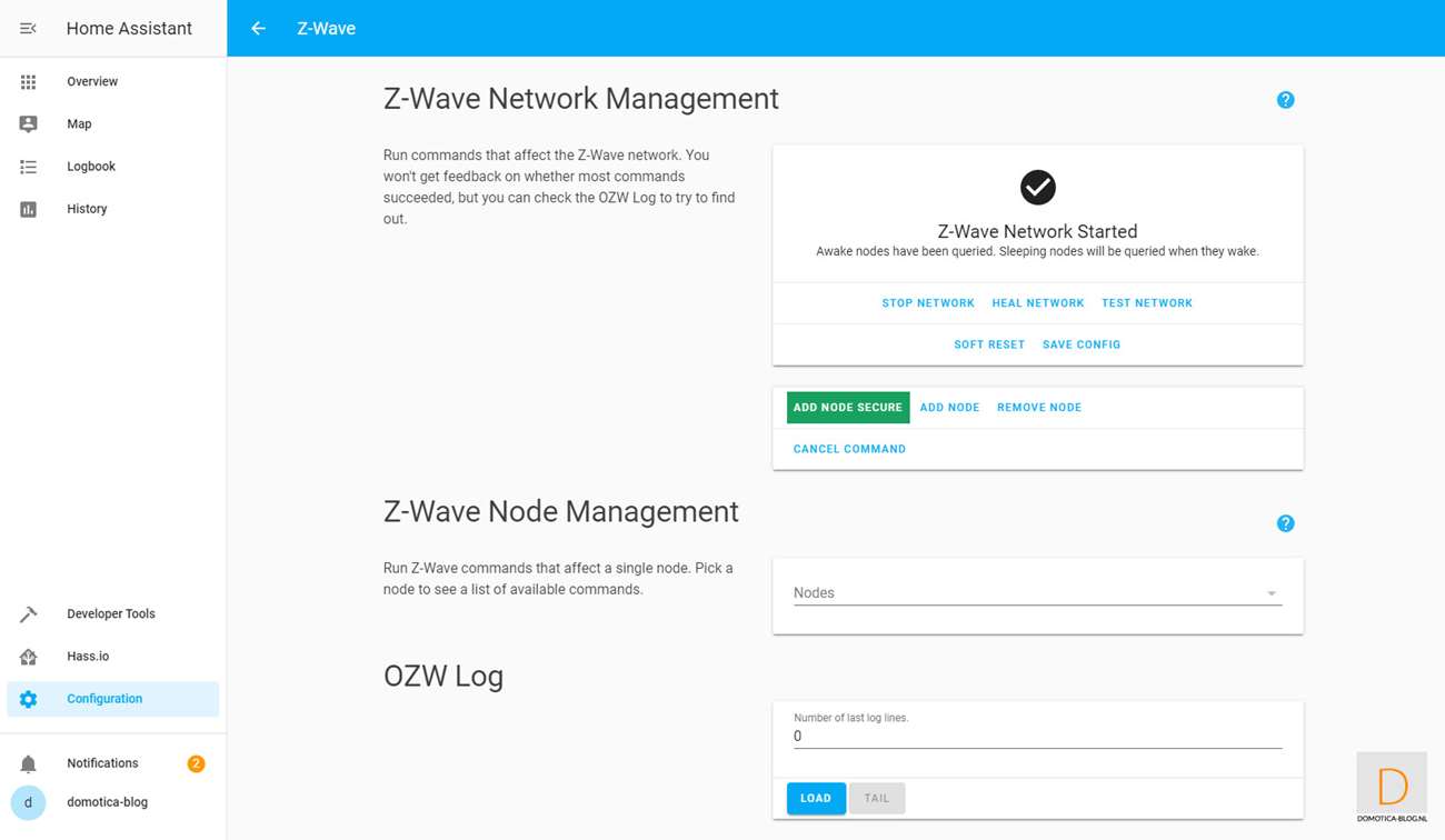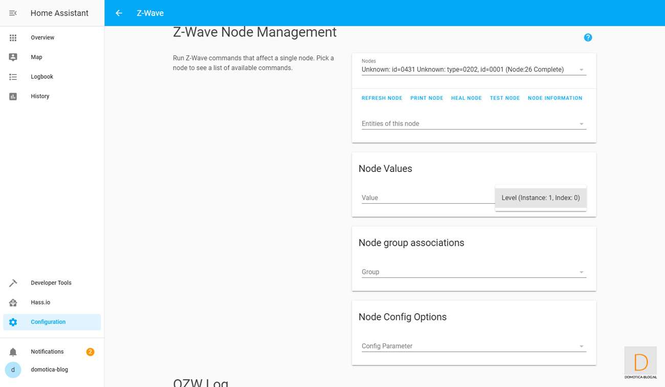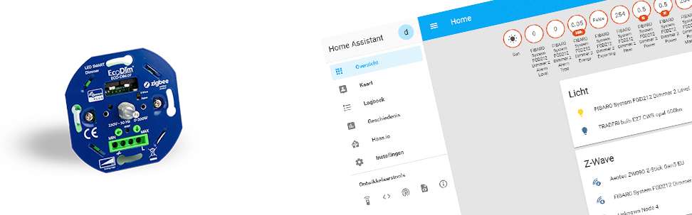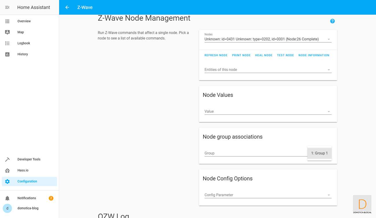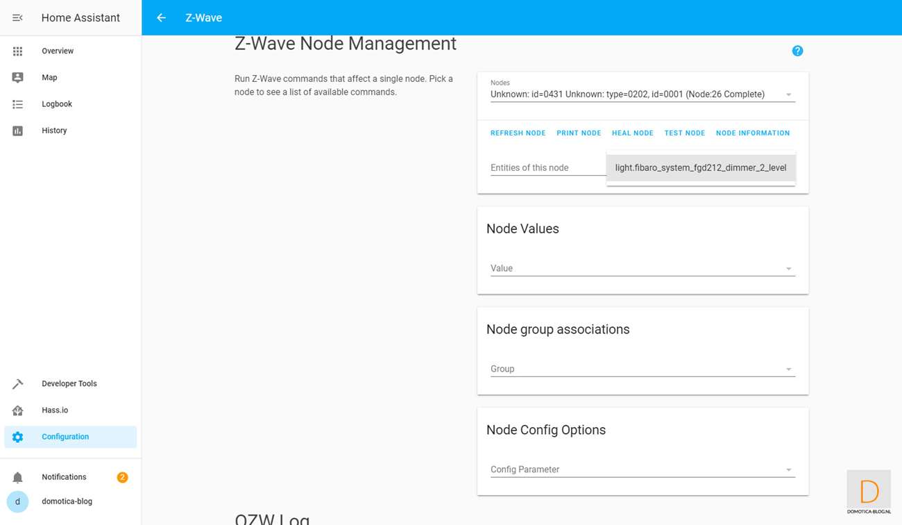 This is because it is easier to add the dimmer first. You do this by logging in to HASS via your browser and going to your configuration and then to Z-Wave. Then click on "add node" to start adding. HASS gives a very short message that the addition has started. You then provide the dimmer with power. Nothing seems to have happened, but after opening the nodes menu I see the Dimmer.