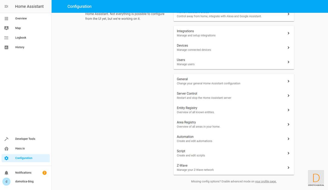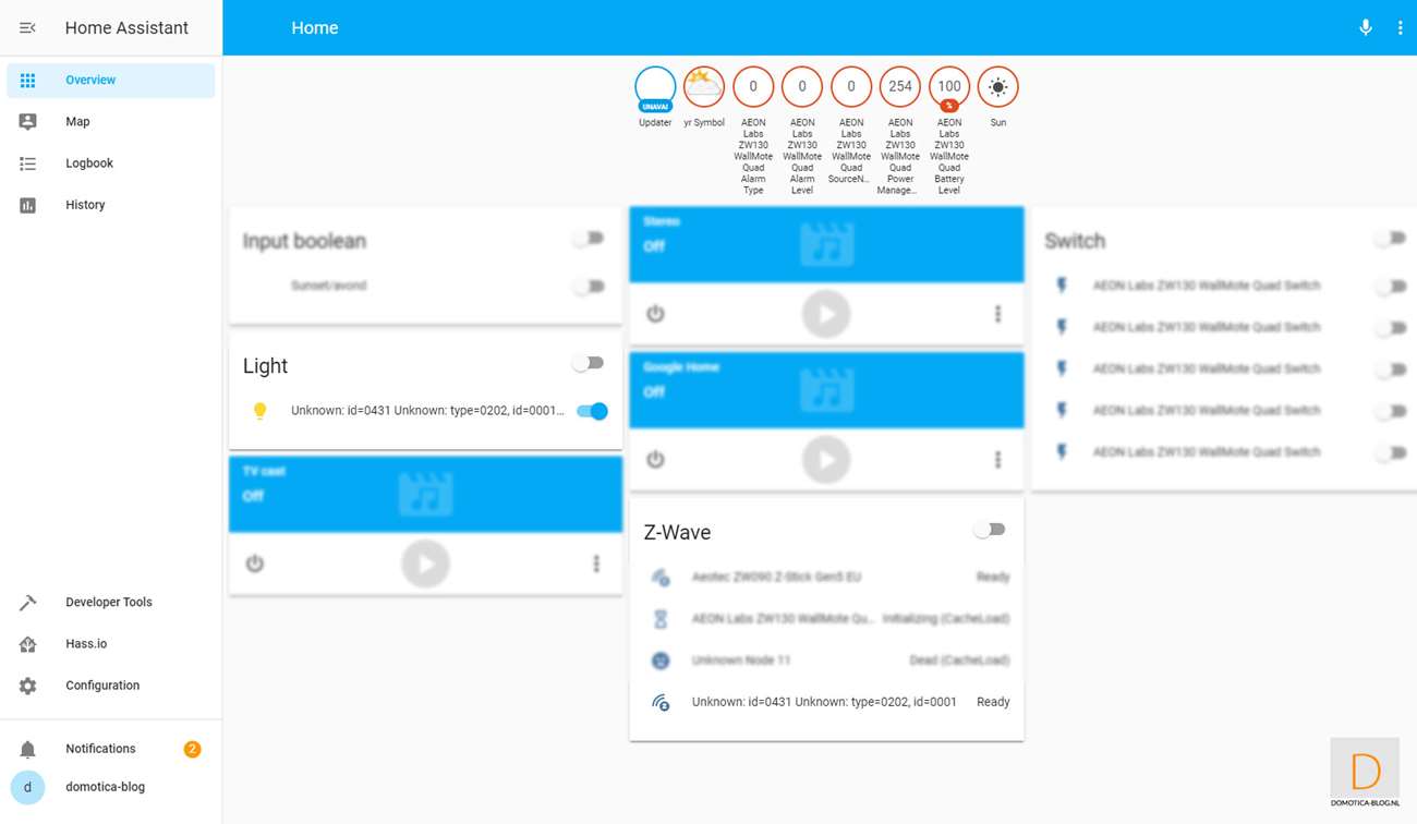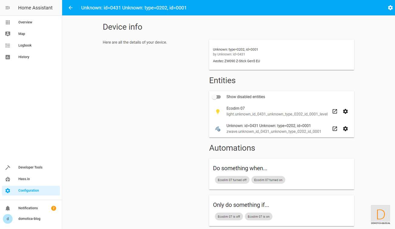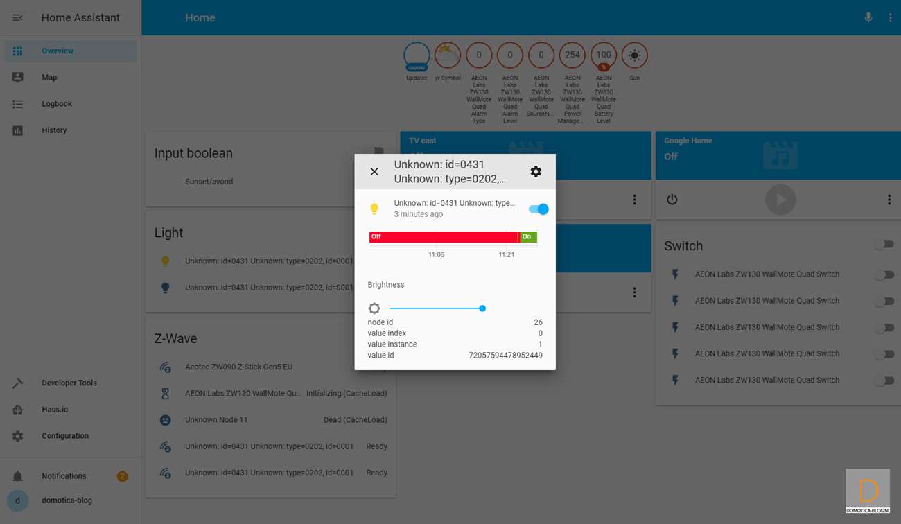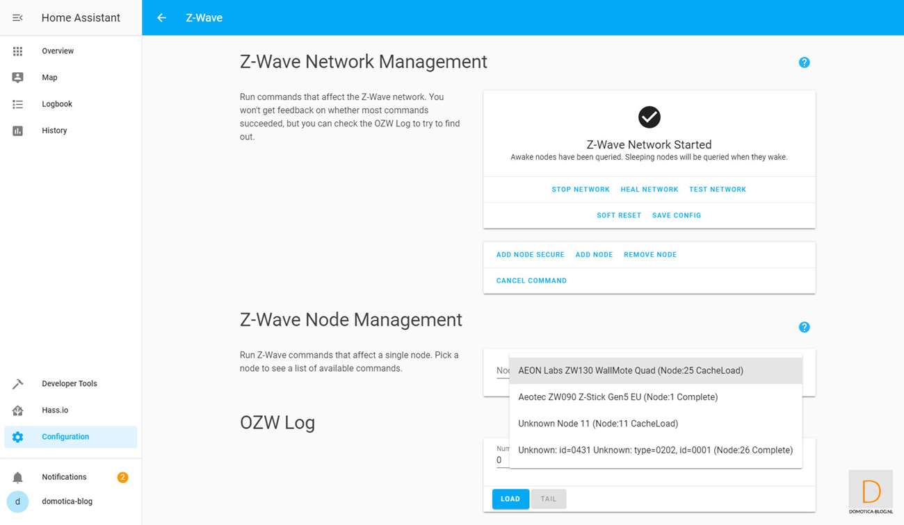 This is because it is easier to add the dimmer first. You do this by logging in to HASS via your browser and going to your configuration and then to Z-Wave. Then click on "add node" to start adding. HASS gives a very short message that the addition has started. You then provide the dimmer with power. Nothing seems to have happened, but after opening the nodes menu I see the Dimmer.