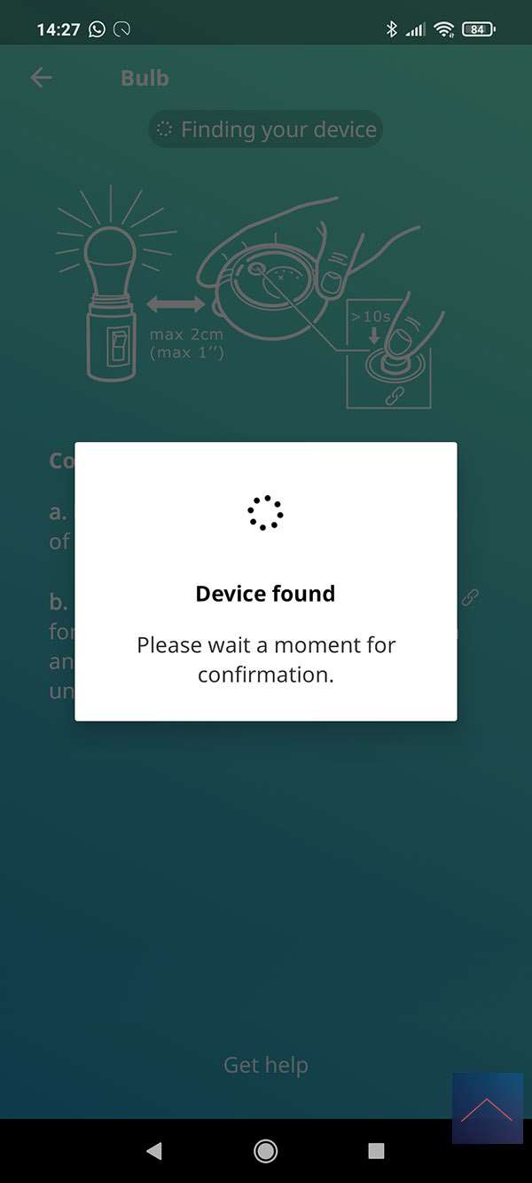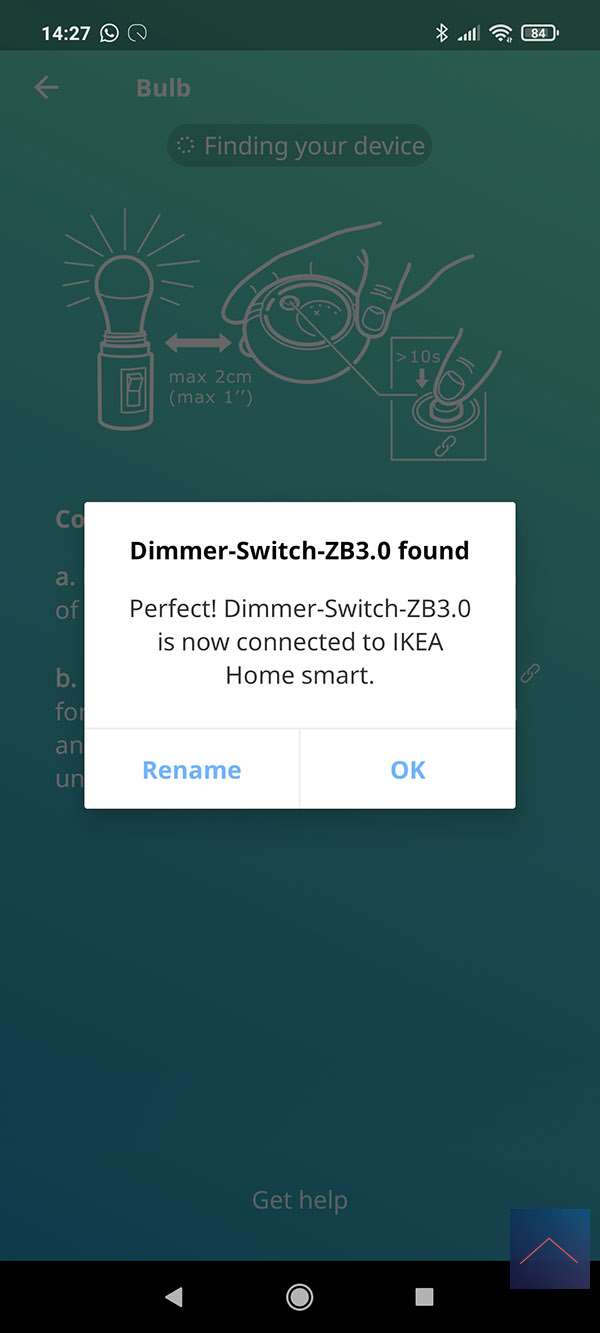 We then supply the dimmer with power and reset it by pressing and holding the reset button for 10 seconds. The LED will light up red and then turn off. Now we press the reset button 4 times in a row. We now start the adding procedure (on the HUB) by clicking on Bulb and then on the Ikea remote control. After this, press and hold the button on the back of the remote control for 10 seconds.