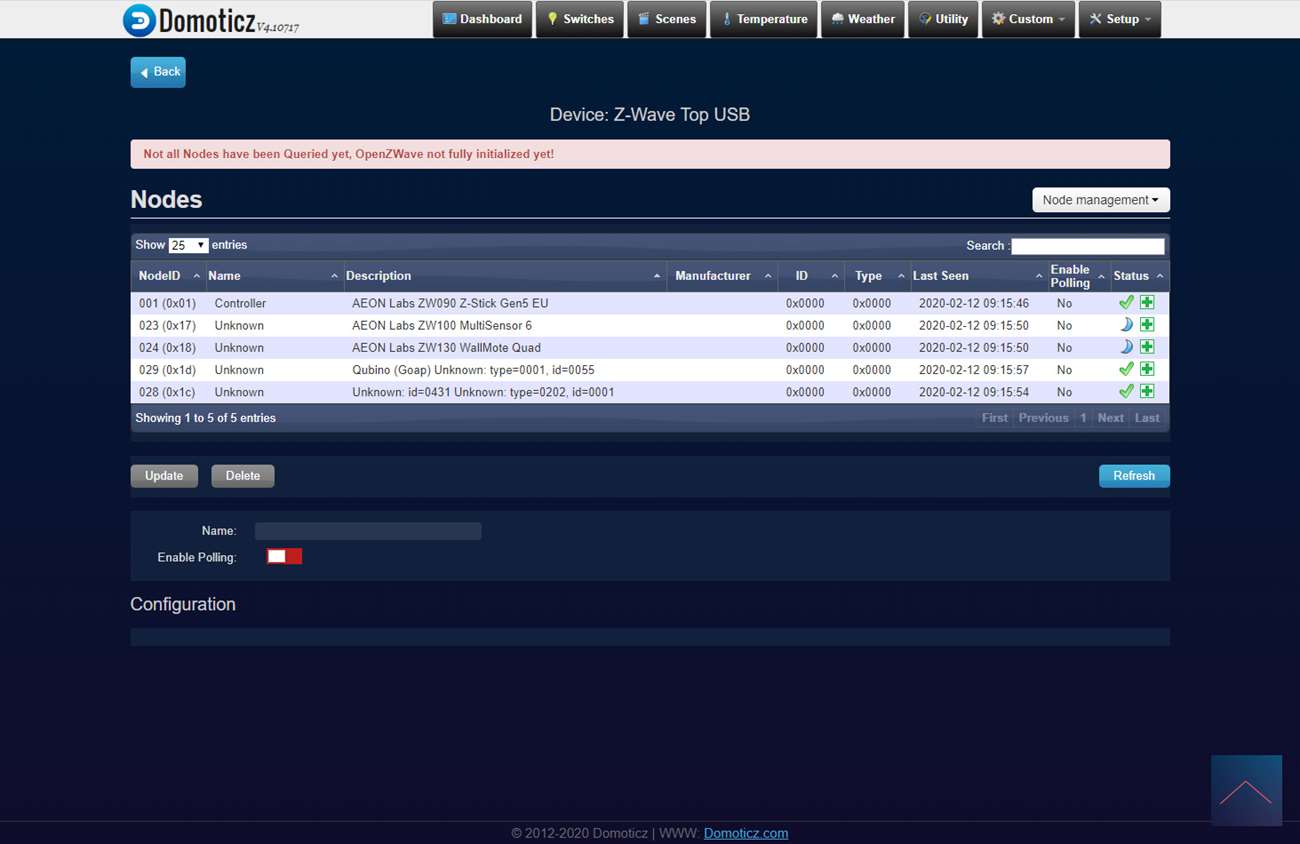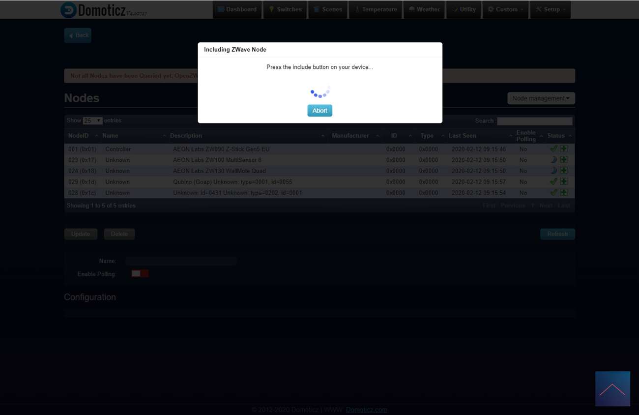 To see if this thermostat works a bit, we will install it via Domoticz. We use an RPI and Aeotec Z-Wave USB Stick for this. The first step is to ensure that the faucet receives power. You can arrange this by removing the cover and installing the 2x AA batteries. Make sure you put them in well. If successful, the display will light up and indicate Inc. Now we can add it. You can do this by logging in to Domoticz and to the setup, hardware and then to the z-wave usb setup. After this we click on node management and then on include node secure.