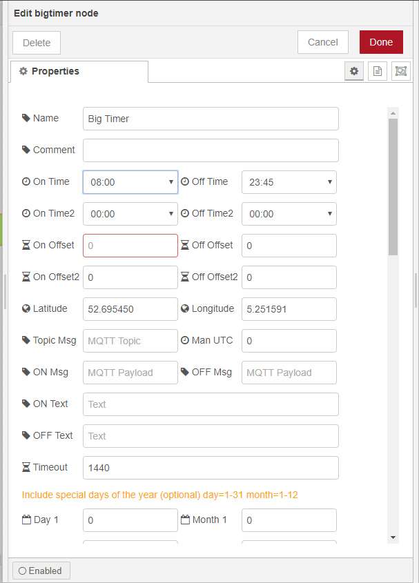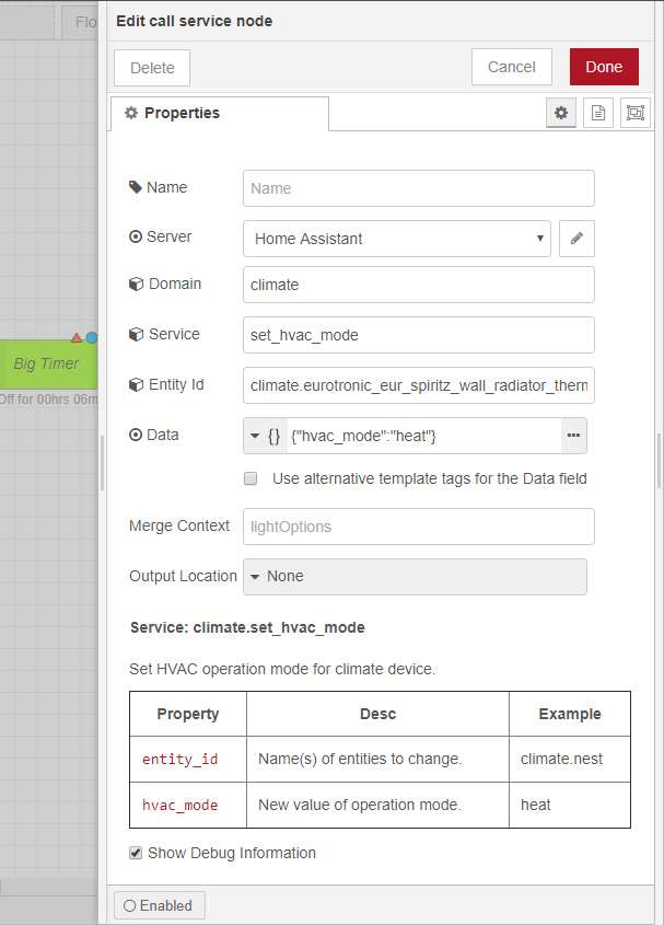 I would like the thermostat to be switched on at 8:00 am. I use the big timer as a trigger for this and when it is 8 am I set the thermostat mode to "heat".