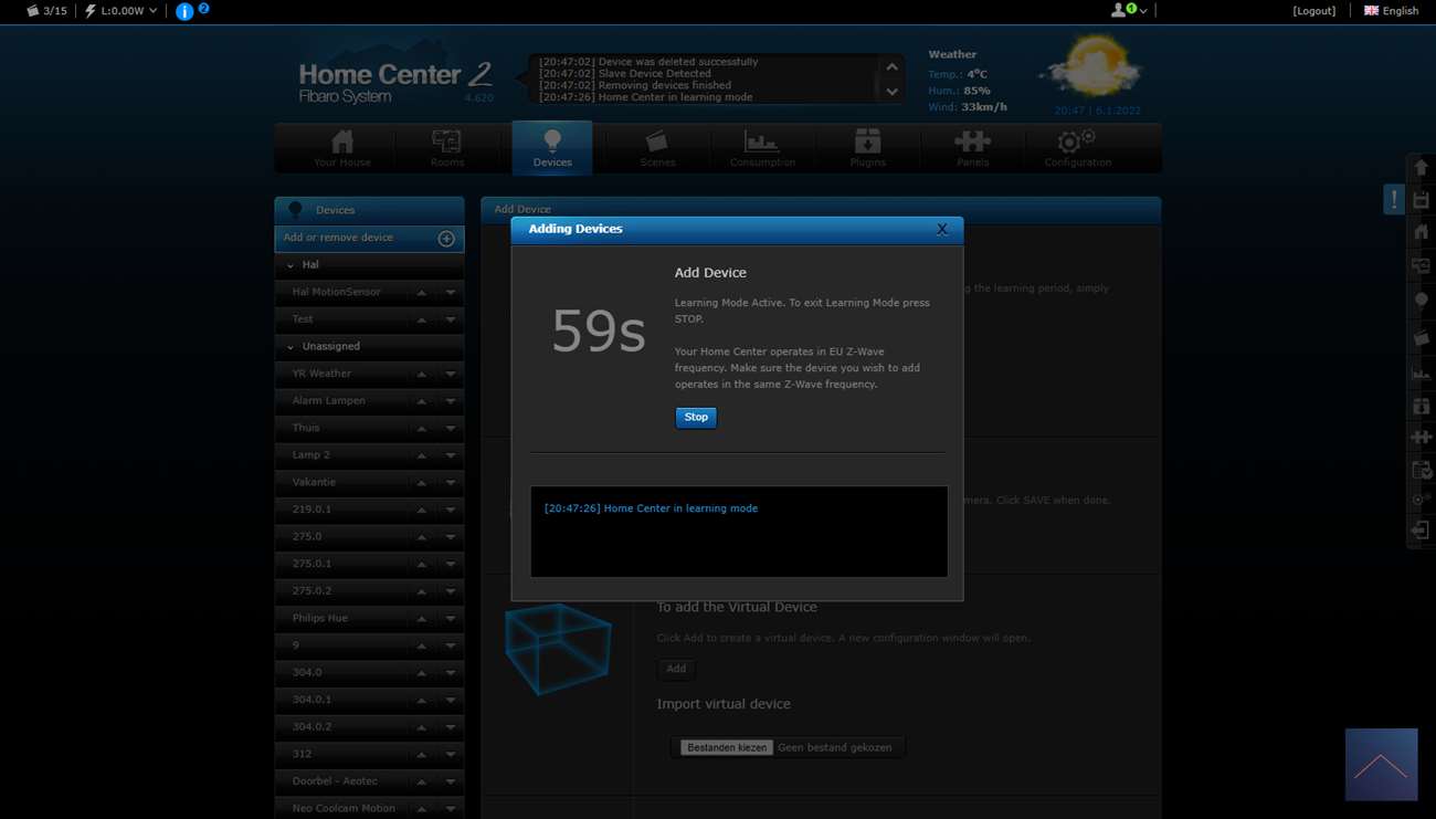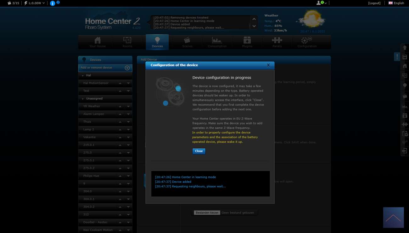 Now everything is ready to be connected to the HC2. Log in to the dashboard and go to your devices and press "add or remove device" and then "add". Now the HC2 is in learning mode. The next step is to press the button on the tap 3 times in a row, the LED will first turn white and then green to indicate that the pairing was successful.