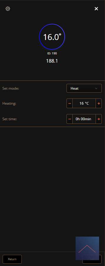 We see the temperature of the sensor, we can set the temperature of the tap, we can change the mode (off, heating and protected) and to top it off we see the battery level. You can also set how long the temperature should be held.