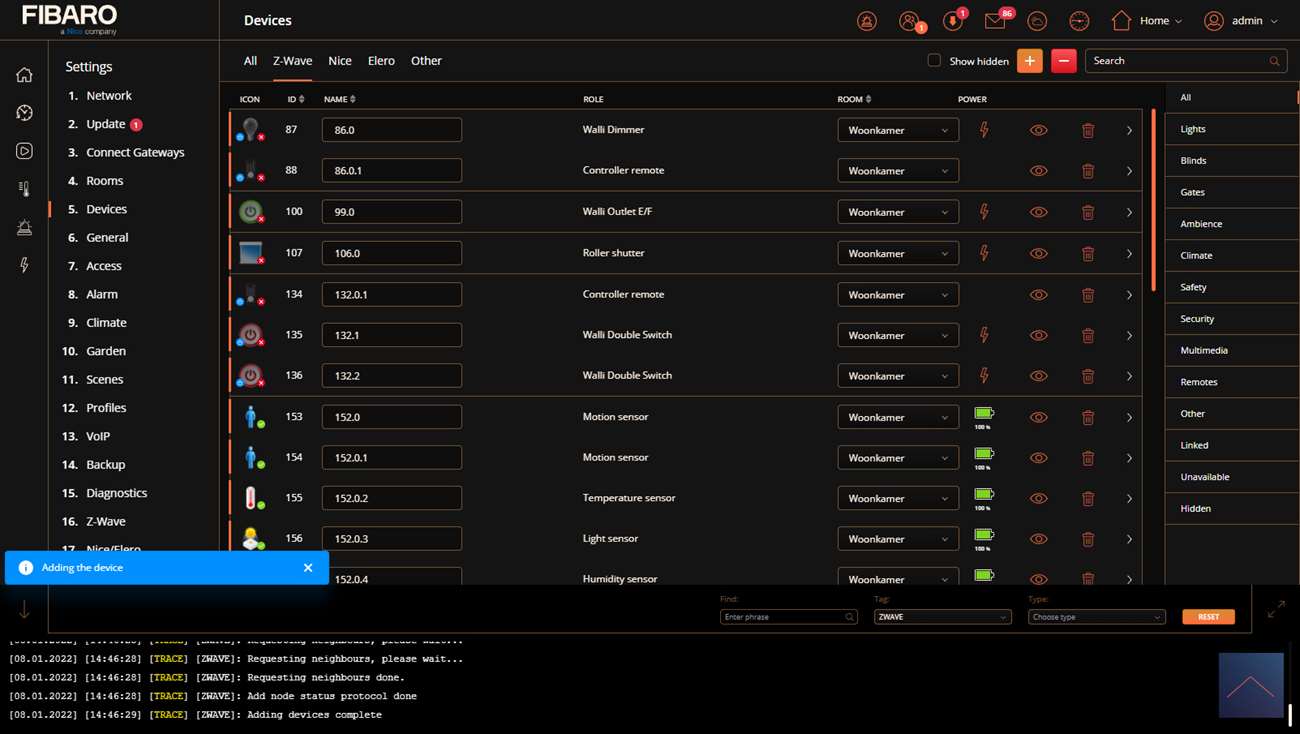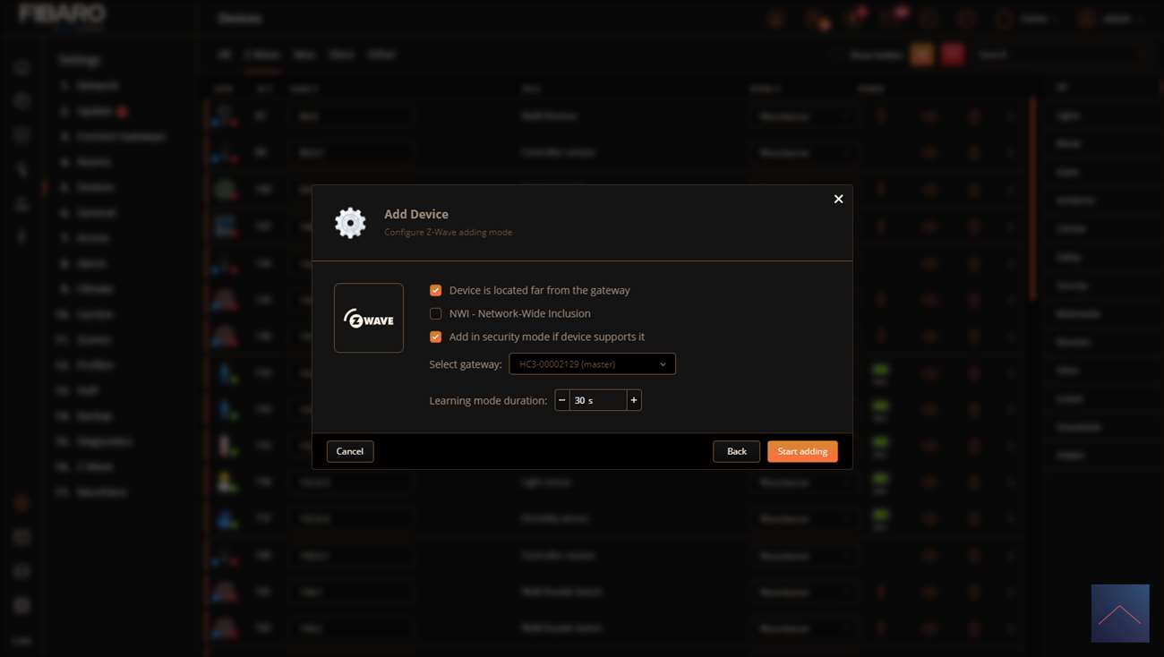 When we have completed these steps, we can connect it to the HC3. We log in to the HC3. We go to our devices and press the plus sign at the top right. Now you have to start adding by pressing the button on the tap 3 times in succession, the LED will first turn white and then green to indicate that the pairing was successful.