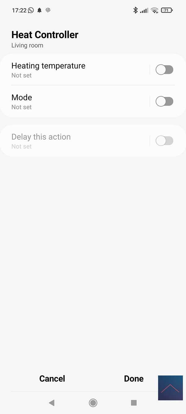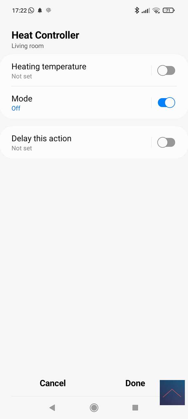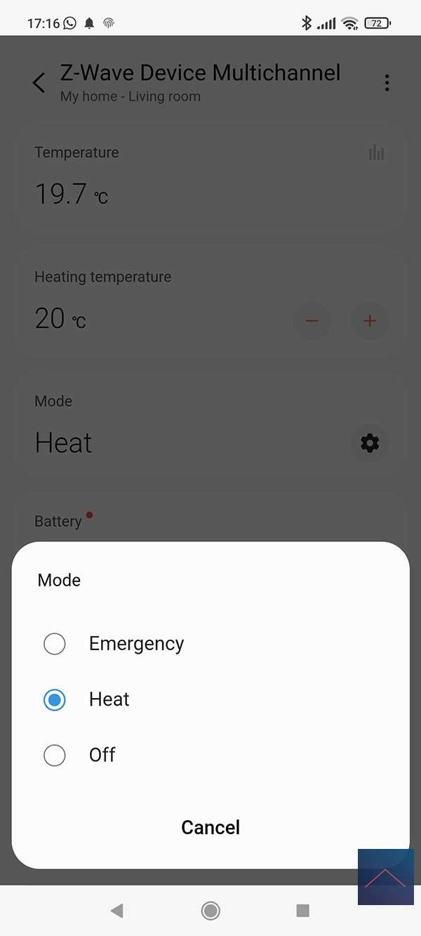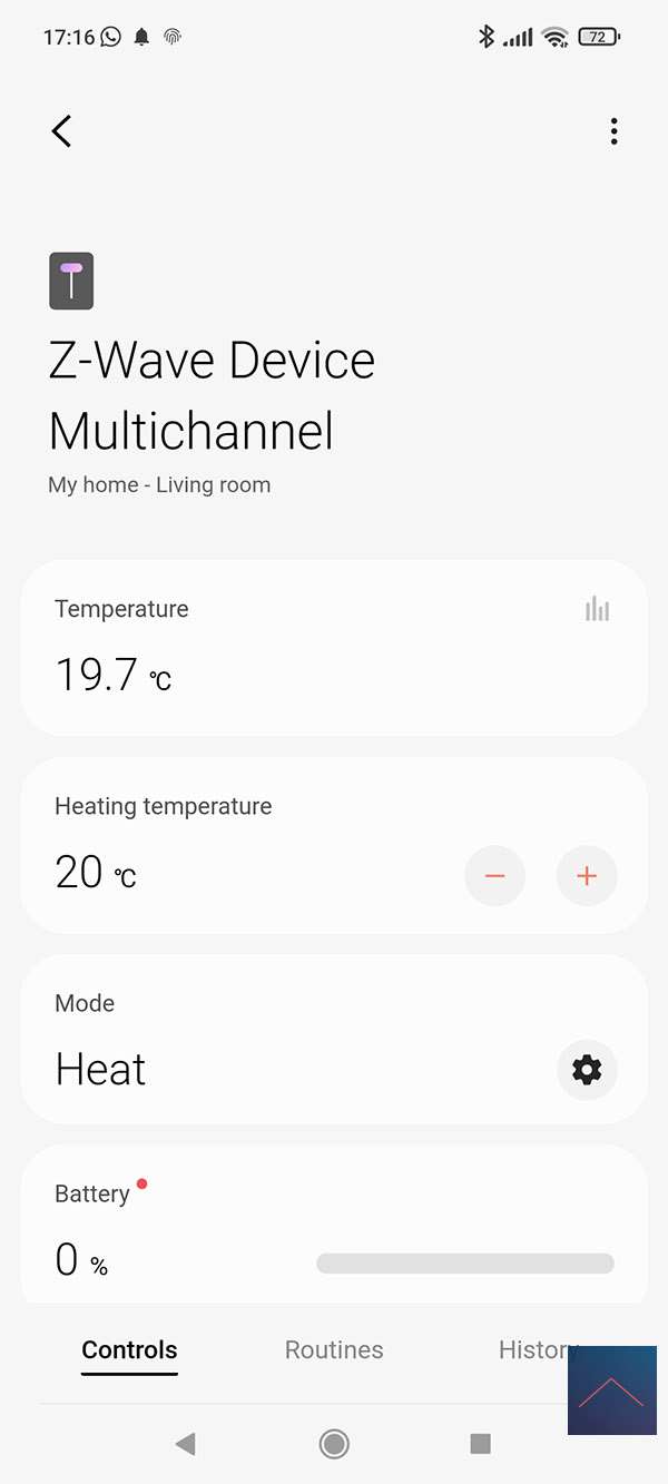 We see the temperature of the sensor, we can set the temperature of the central heating system, we can change the mode (Off, heating and protected). Unfortunately we do not see the battery level.