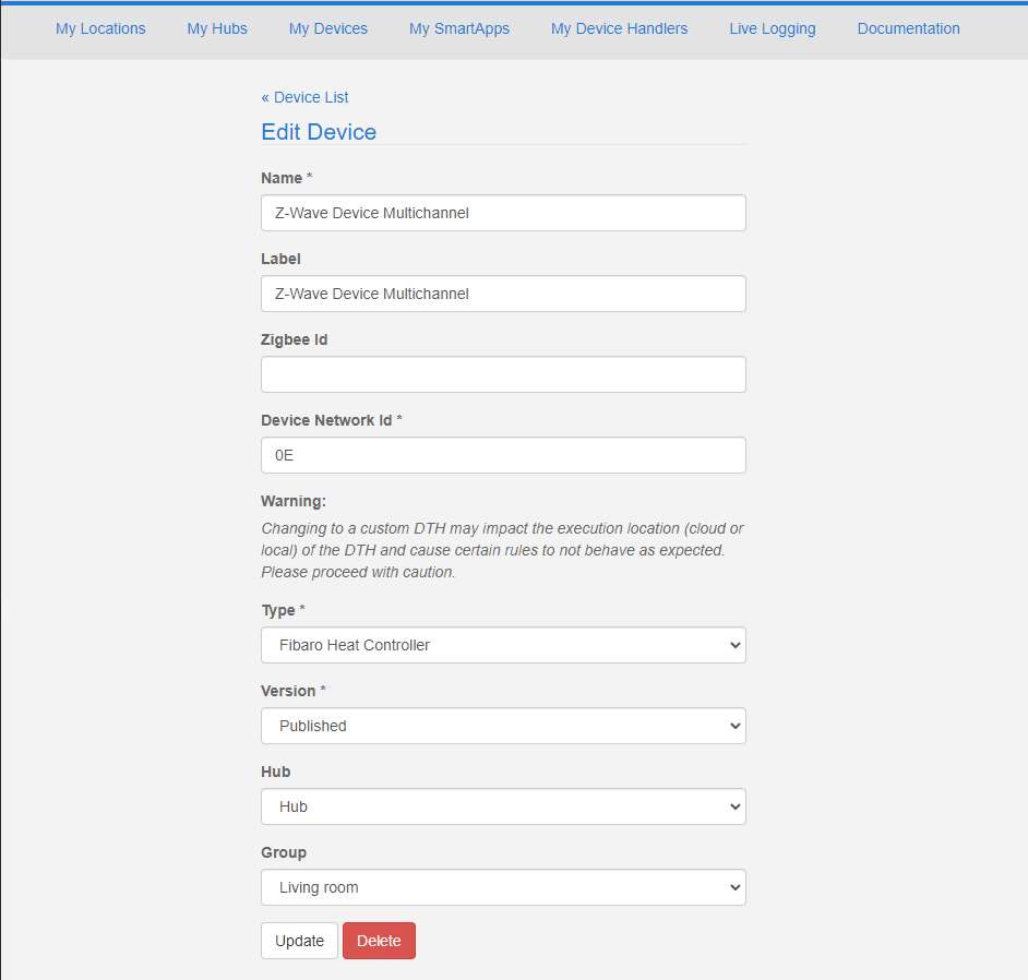 Unfortunately, it is added as a "multichannel device", which means that it does not have the correct properties. Fortunately, you can easily change this via the web interface (https://graph.api.smartthings.com/) because this Heat Controller should be supported. When you are logged in, go to your devices and click on the "errors" heat controller. Then we do "edit" and we can put it on the Heat Controller and don't forget to click on save.