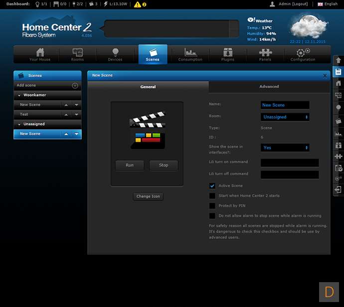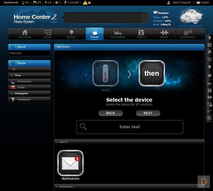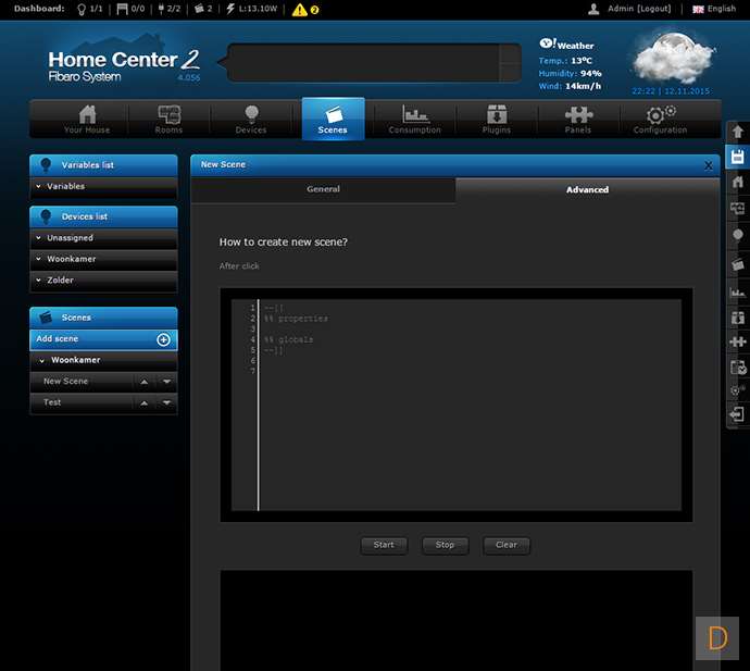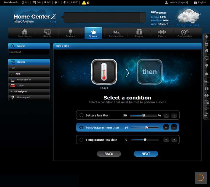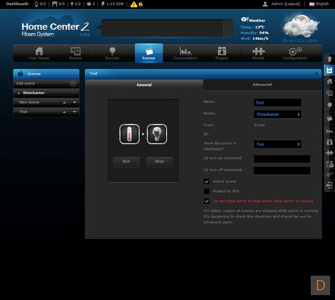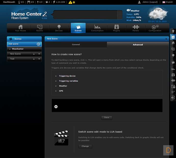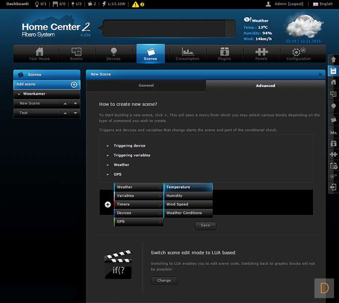Creating scenes is very simple this way. With a few clicks you can create a rule without programming knowledge. The disadvantage of this way is that you cannot make complex rules. But fortunately the Fibaro has 2 other ways for that.
