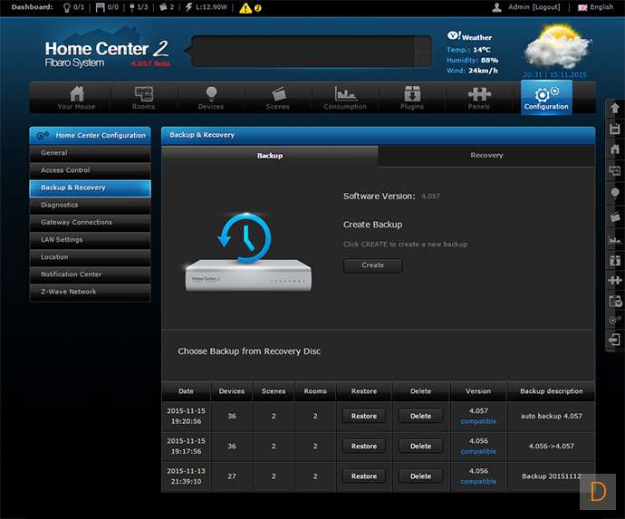 As the name suggests, you can make backups here and restore them. Great if you make a mistake somewhere by accident. A backup is made of your scenes, rooms and Z-Wave configuration. You can make a backup both in the cloud and locally. Well arranged.