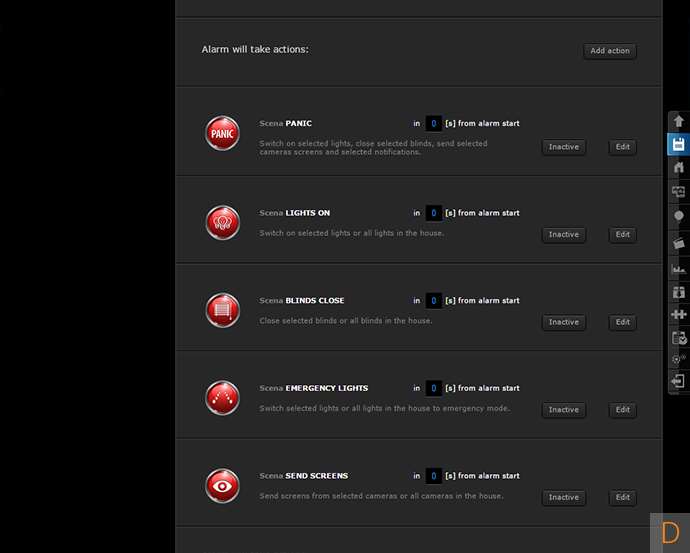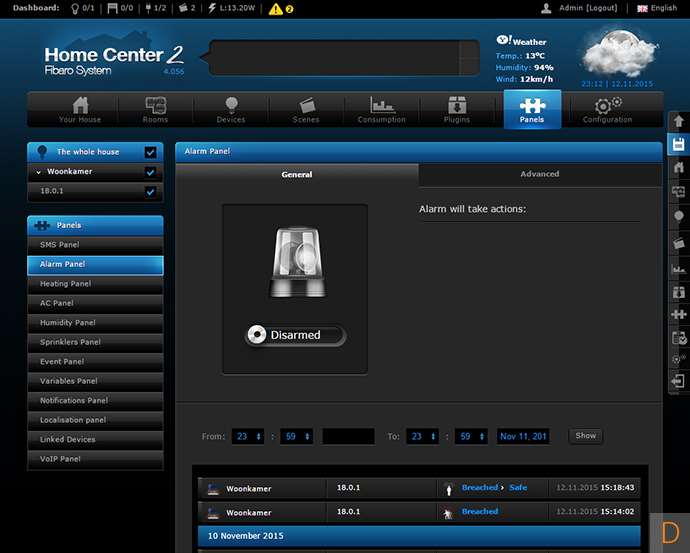 This section contains standard functionalities such as your alarm, climate and events section. The alarm and climate section is very extensive. Other controllers can learn something from this.