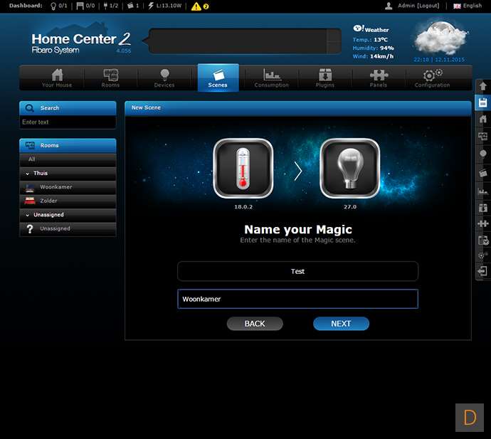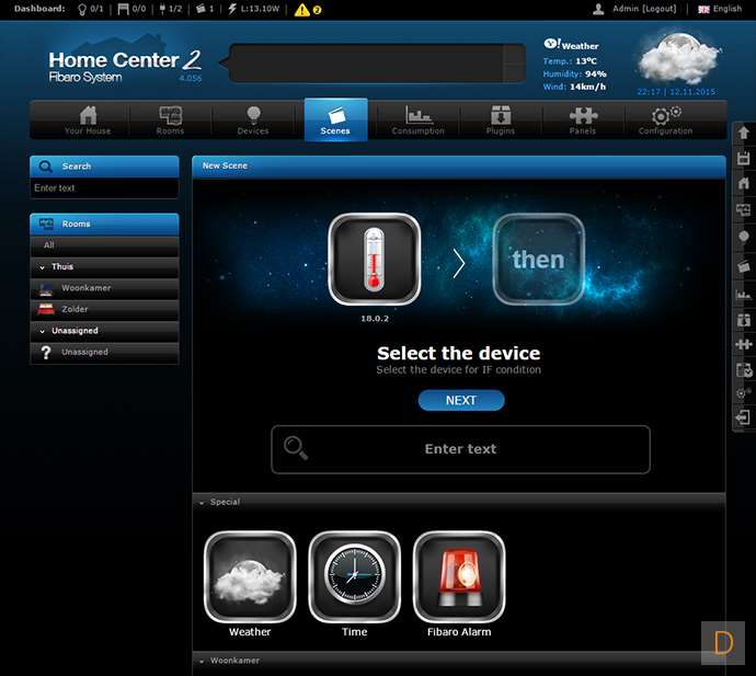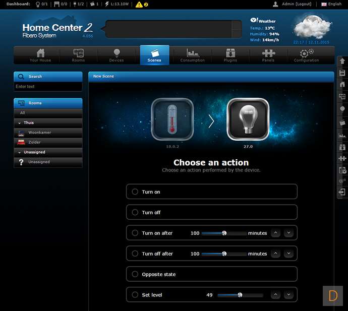 What makes a home automation system really smart are scenes / rules. With these scenes you can automatically arrange everything in your house. For example, you can ensure that your lights turn on automatically when the sun goes down or that the power is turned off when you leave home.