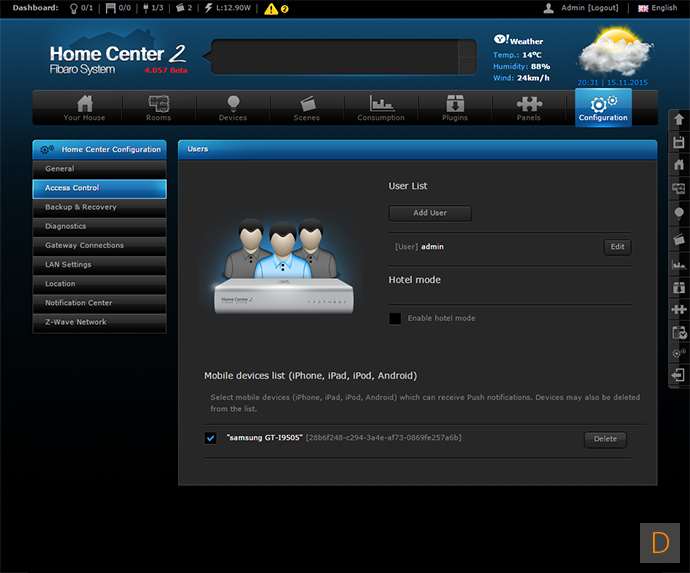 Here you can create users who may have access to your controller. Unfortunately it is not possible to assign rights to certain parts. You can assign rights to devices, scenes and heating zones.