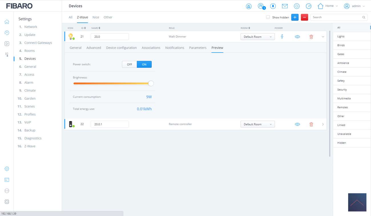 Now that we have added it, the connected lamp can be operated via the switch as well as via the HC3. The status is kept in both places. We can switch the lamp on and off, dim it and see the energy consumption.