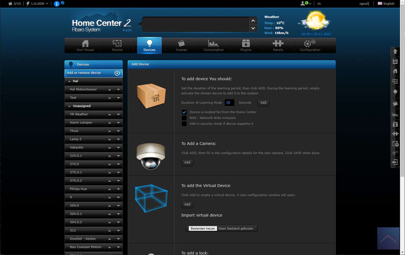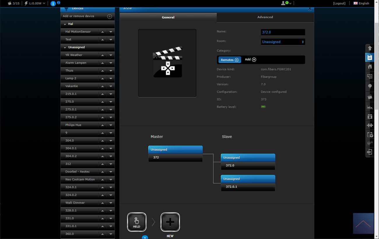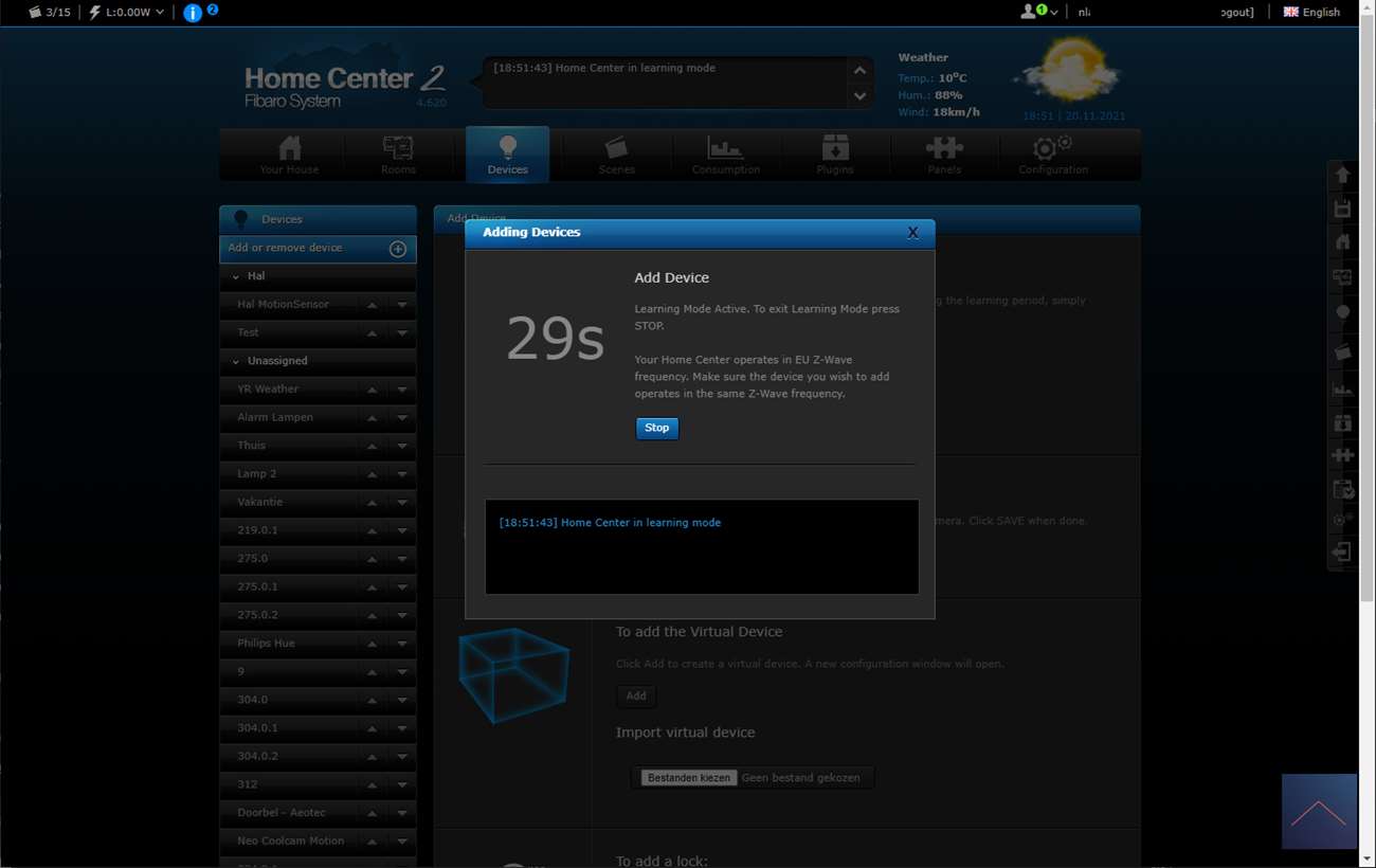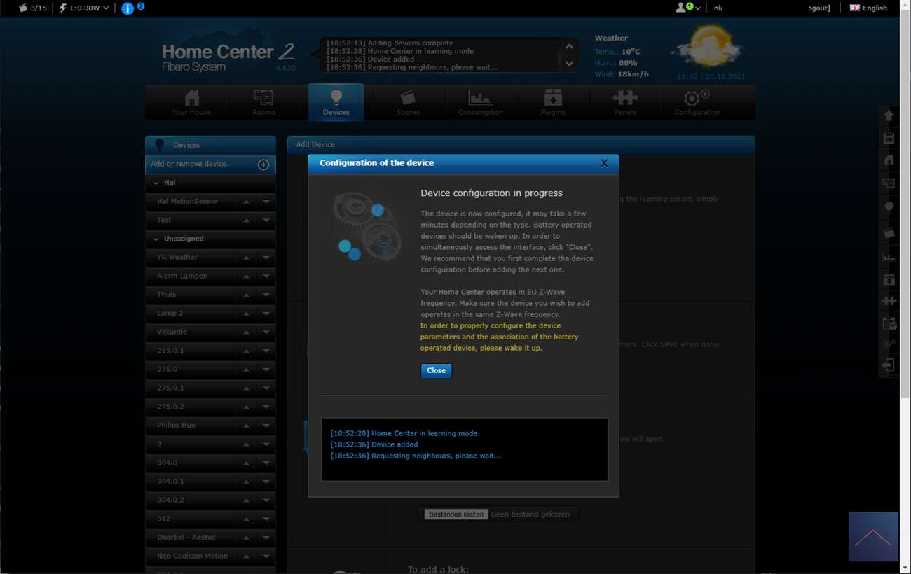 Now we put the button back and log in to the HC2 and go to our devices. Now we click on "add new device" and then on "add". Now we have to press the button on the controller 3 times in quick succession to activate the add. It will be found quite quickly after this and see the LED flash yellow.