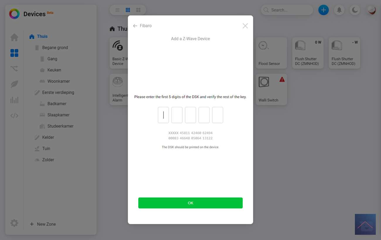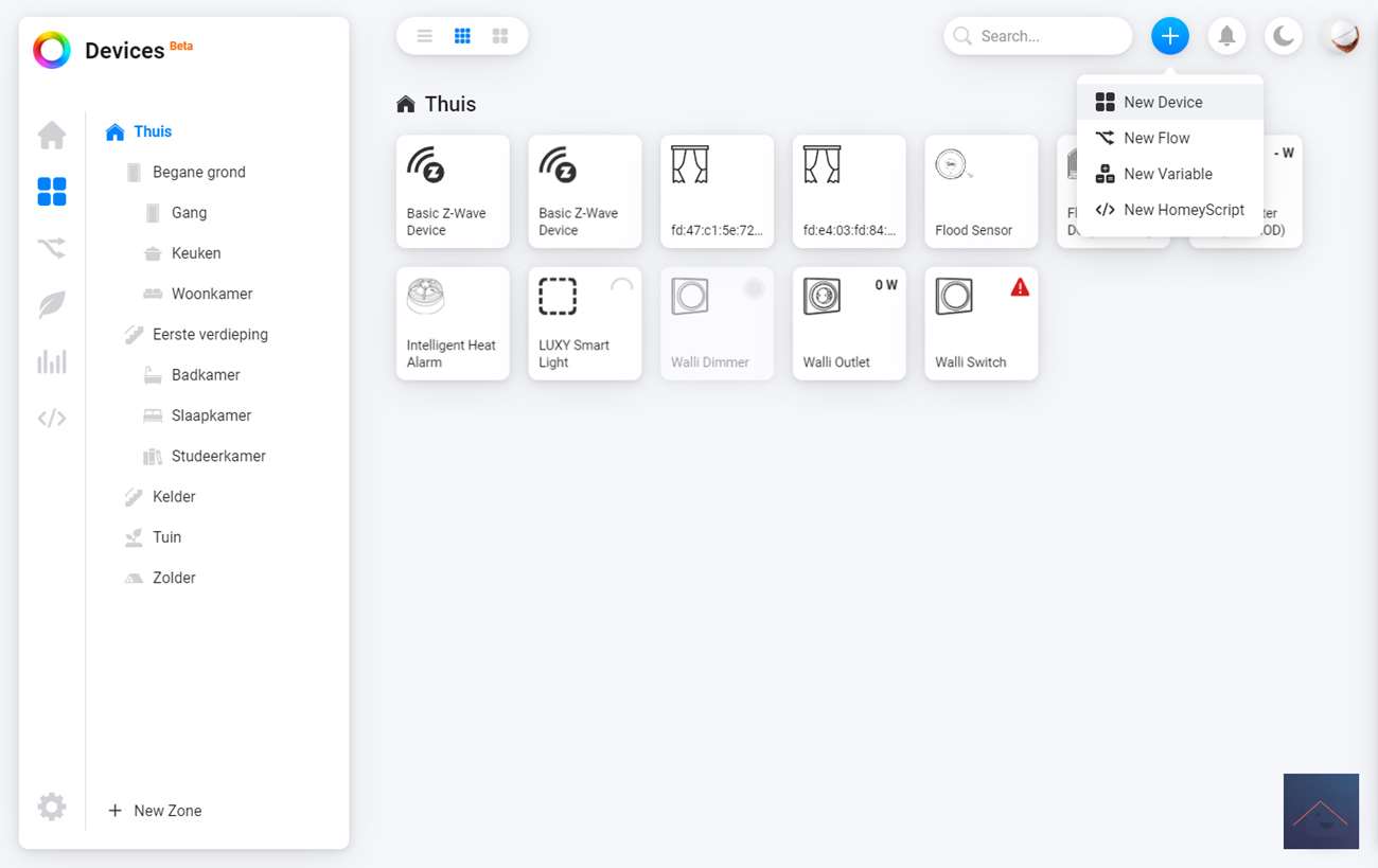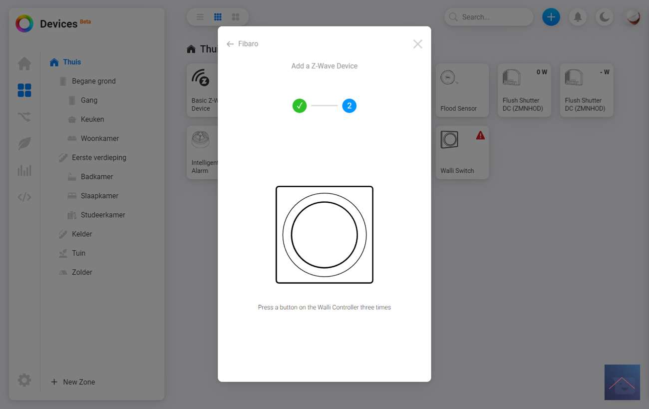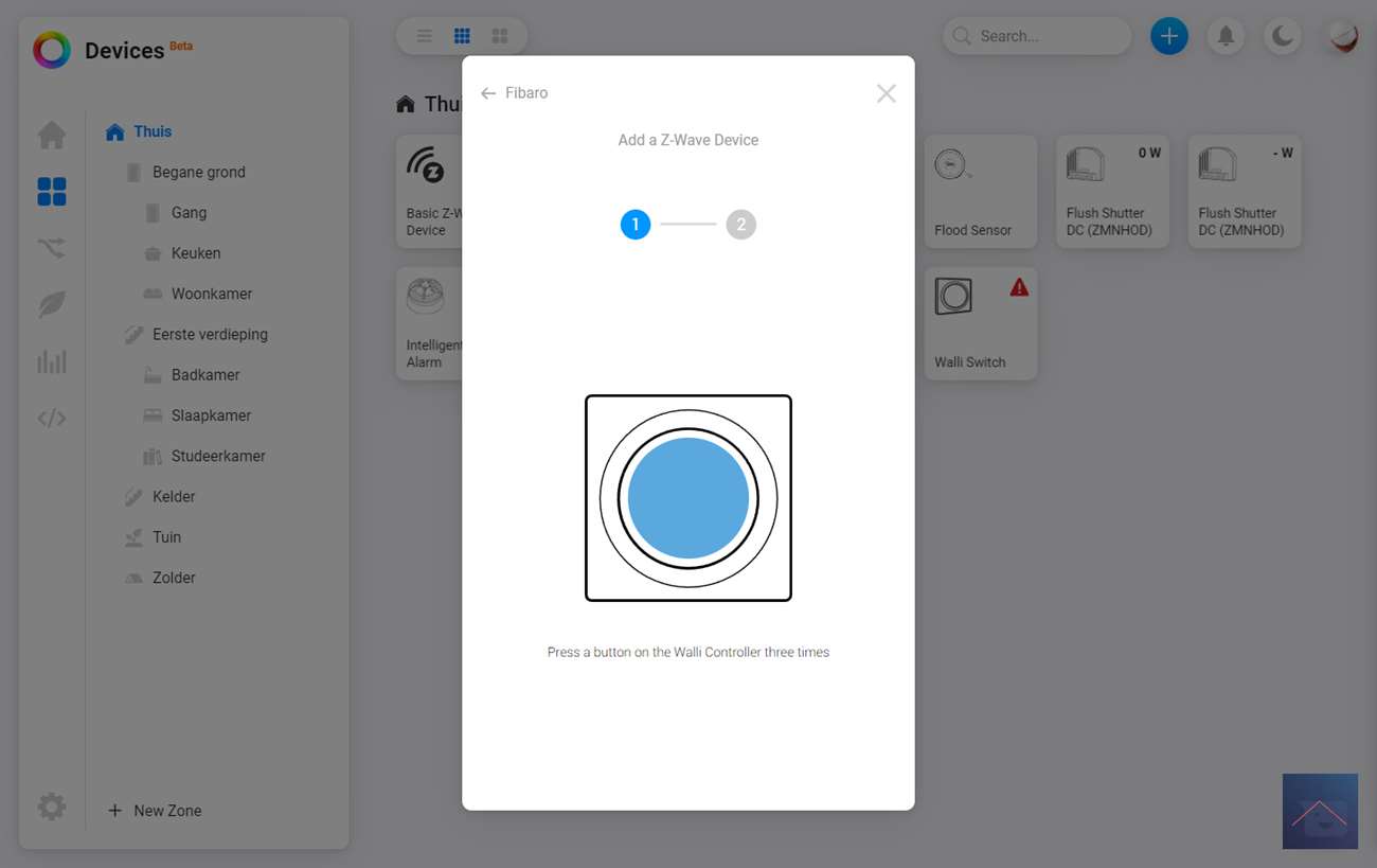 To put the Walli in learning mode, we press the button 3 times. The LED will flash yellow and then red, the Homey indicates that it has been deleted/reset. Now we have to press the button again 3x in a row. Now I see the LED flashing yellow indicating it is being added. After entering the SDK code (which you can find on the packaging), I also see confirmation on the Homey.
