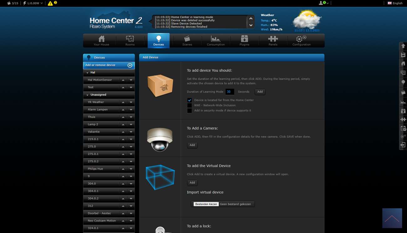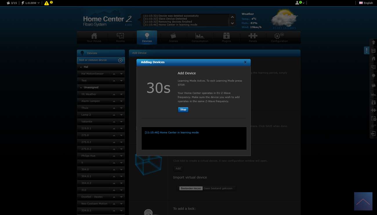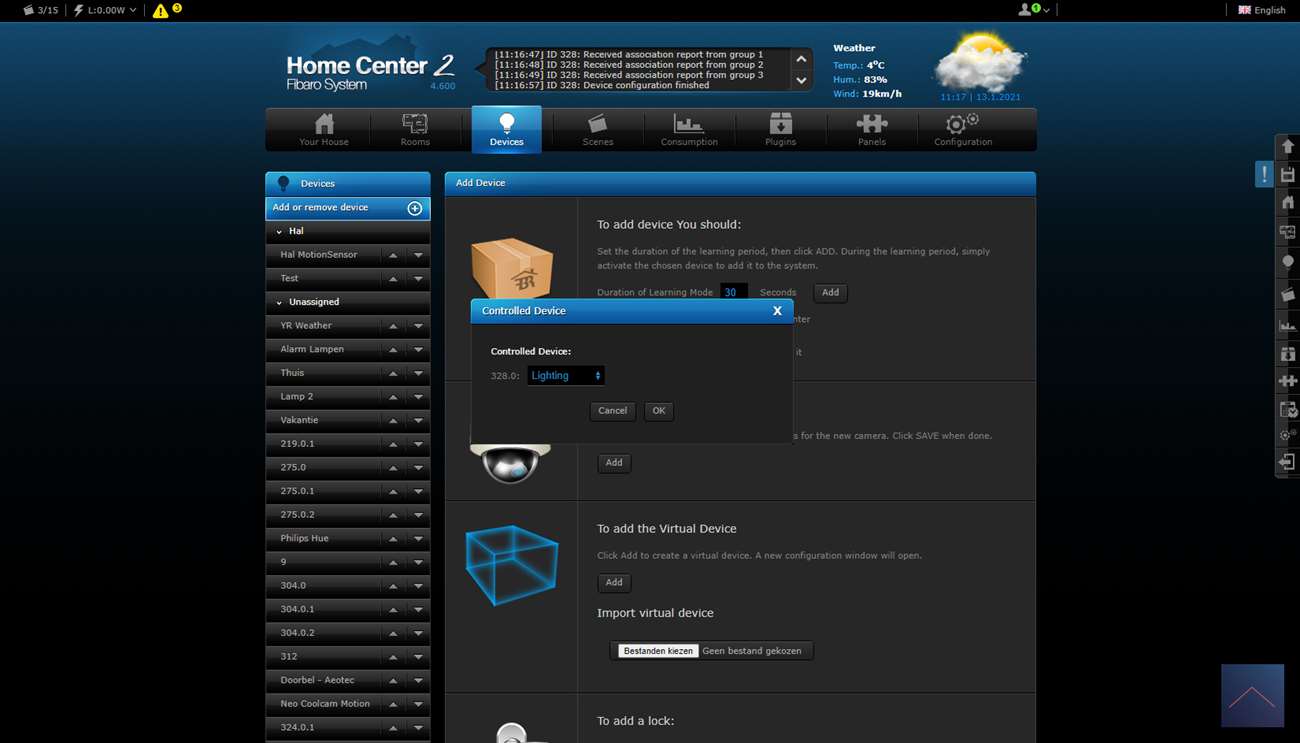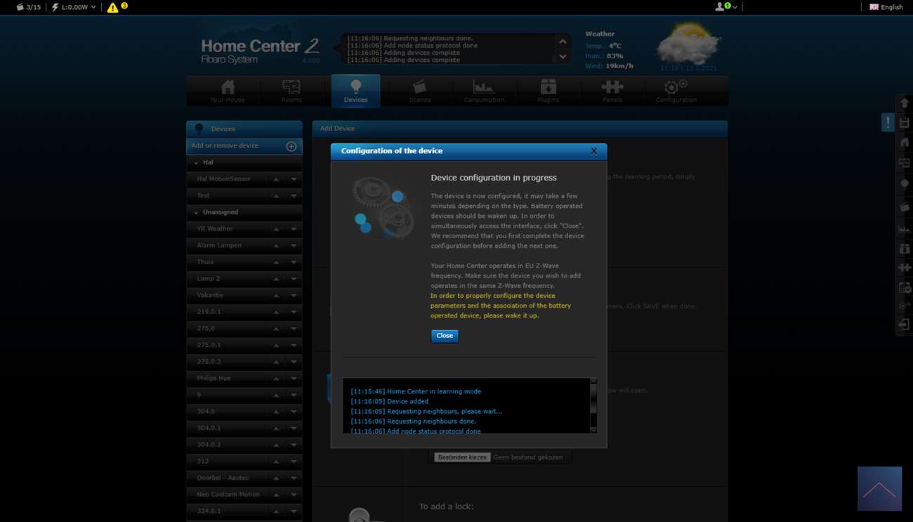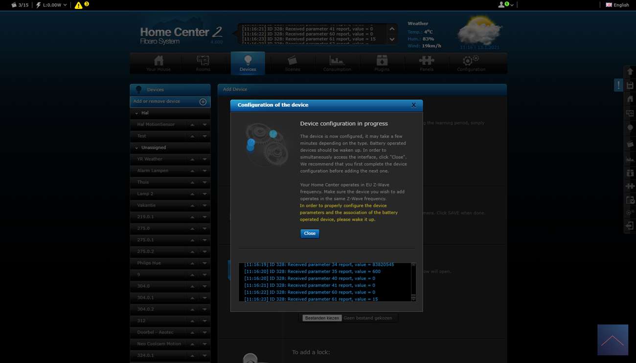 Then click on "add or remove device" and then tick the box "add secure". Adding will now start on the HC2. Now we also have to activate this on the Walli. You can do this by clicking the on button 3x. The LED will light up yellow and then turn white in color. I see all kinds of nice sentences and numbers in the HC2 which indicates that it is being added.