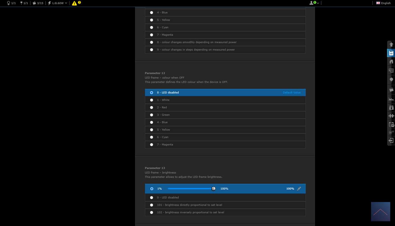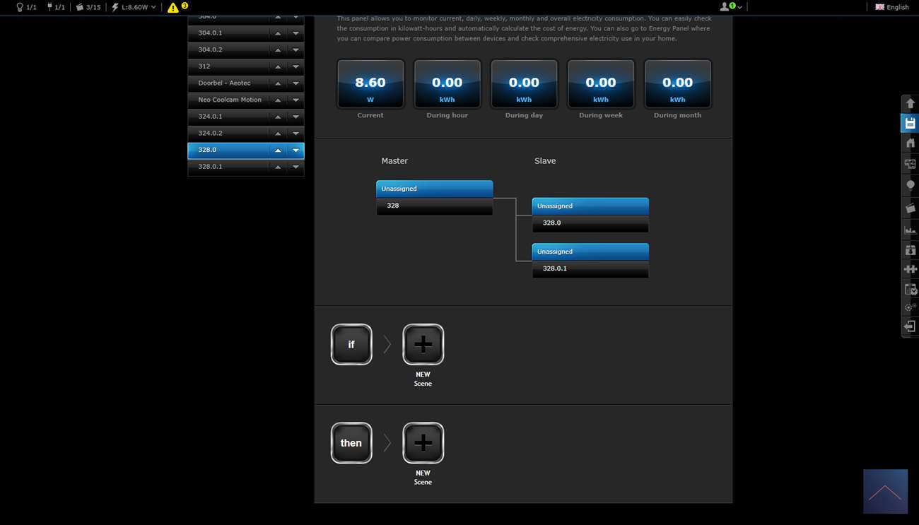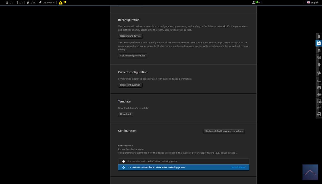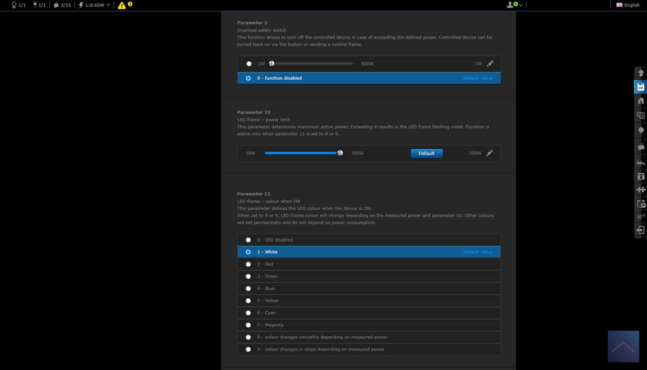 I can of course switch the Walli on and off and dim it. You also see the current consumption and total consumption. You can use the parameters to set that if you press the button 2x in quick succession, the dimmer will go to 100%.