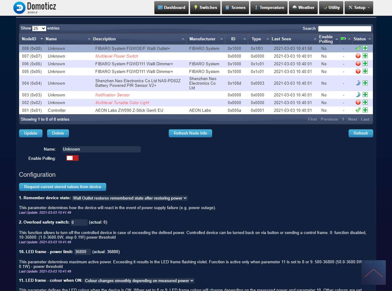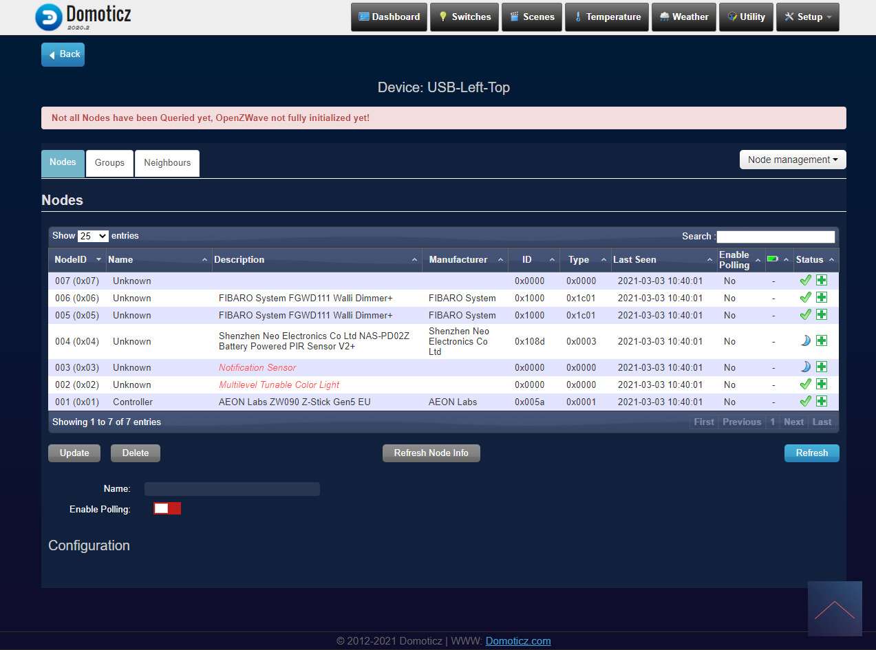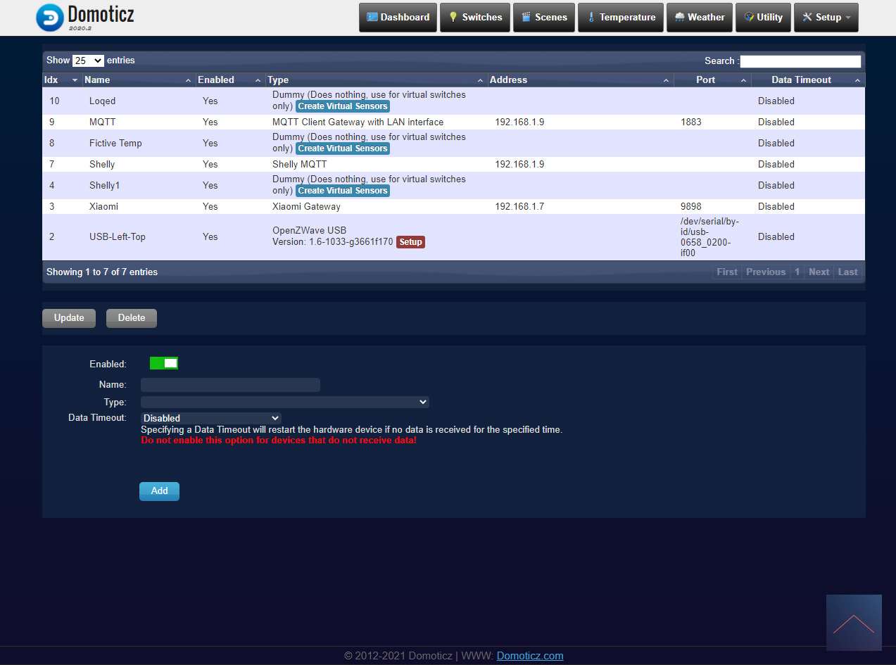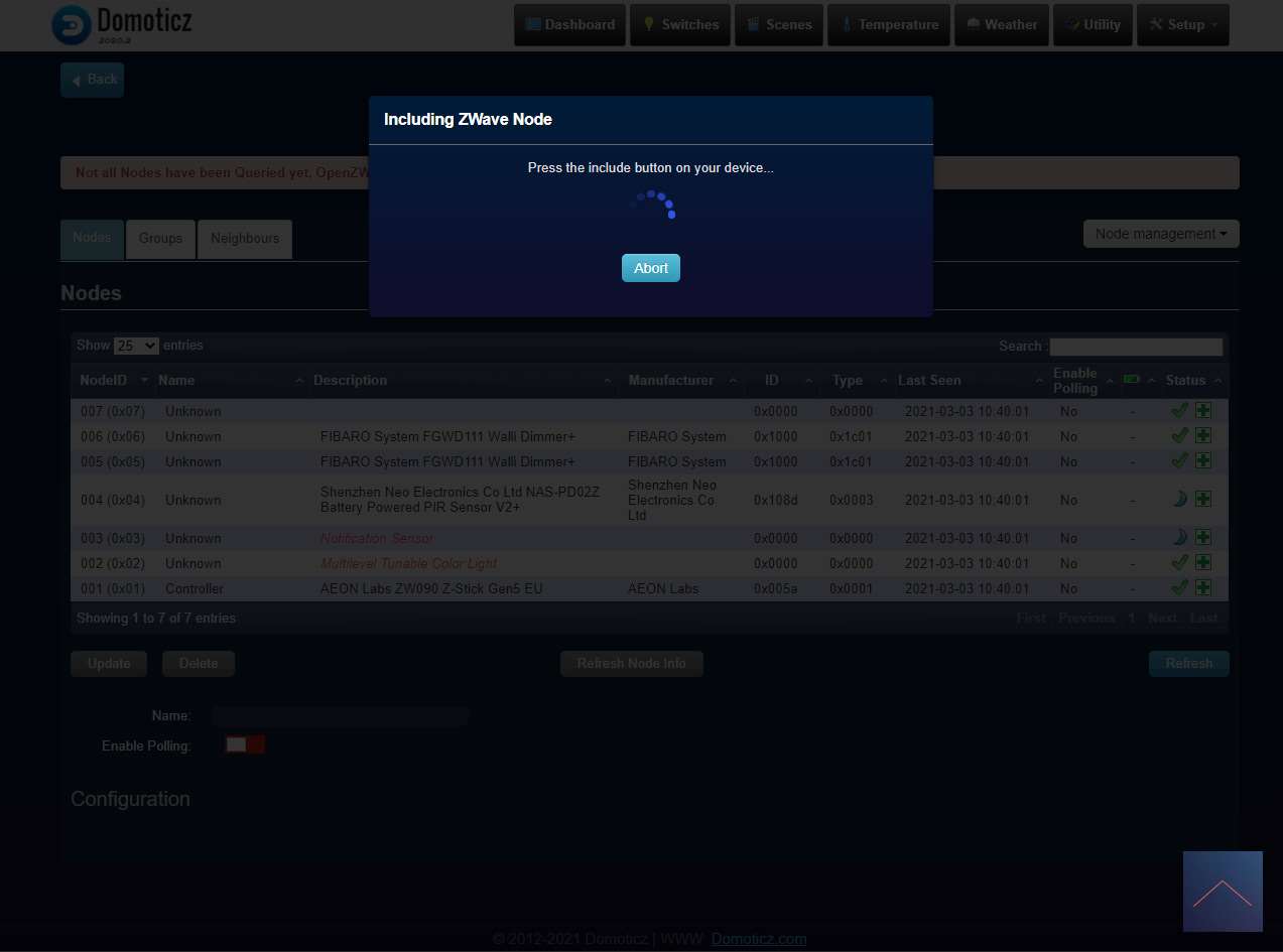 Then log in to Domoticz and go to the menu item "setup" and "hardware". Then press the setup at the Aeon Labs controller and press "include node secure". There will be a popup that the controller is in learning mode. Then press the add button 3x with a small screwdriver. The LED will flash green and then light up white to indicate that the addition was successful.