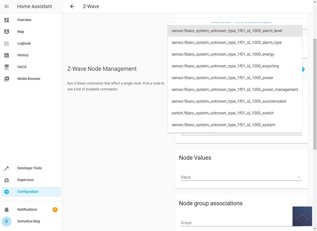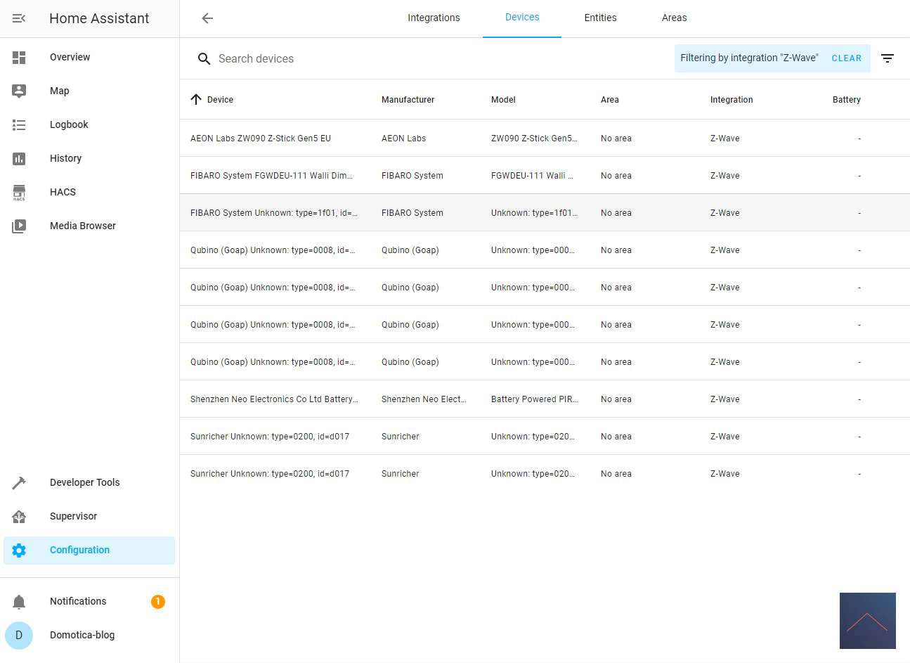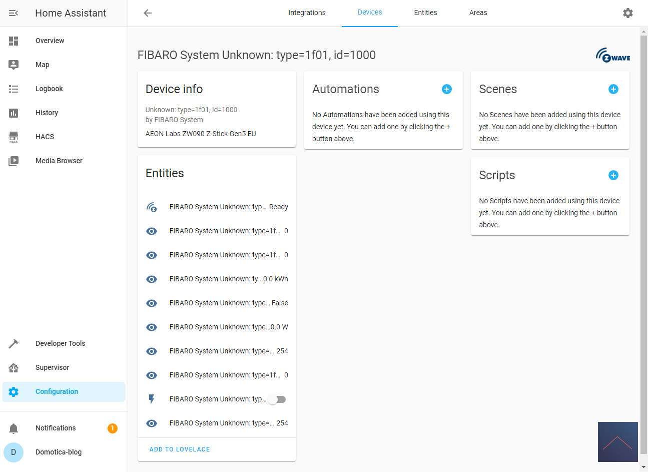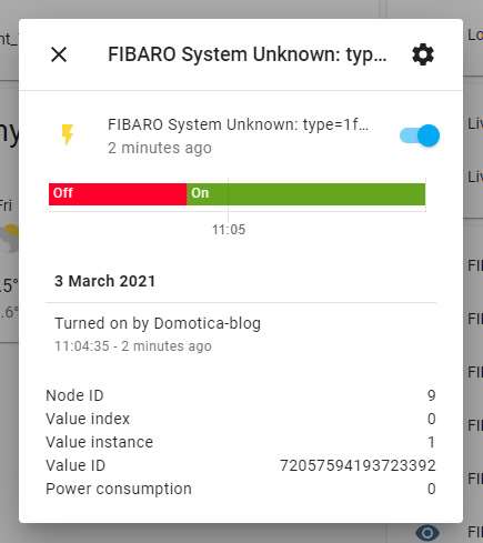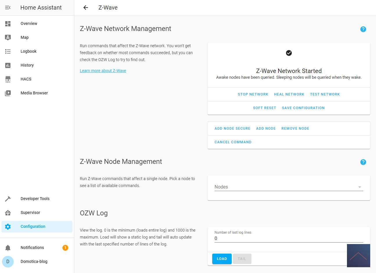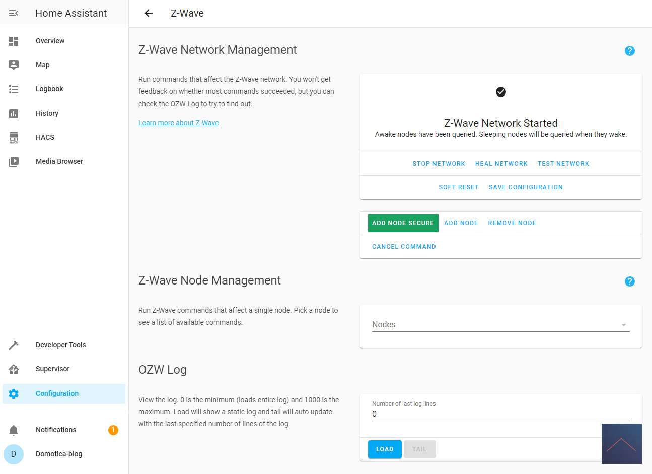 Now we can add it. We first log in to Hass via your browser and go to the configuration. After this we go to "integrations" and press "configure" at the z-wave part. Then click on "add node secure" to start adding. Now we press the button on the front of the socket 3x in quick succession. The LED will light up green and then turn white in color. HASS will give a very brief notification that adding has started. When I look at my devices after a while, I see it.