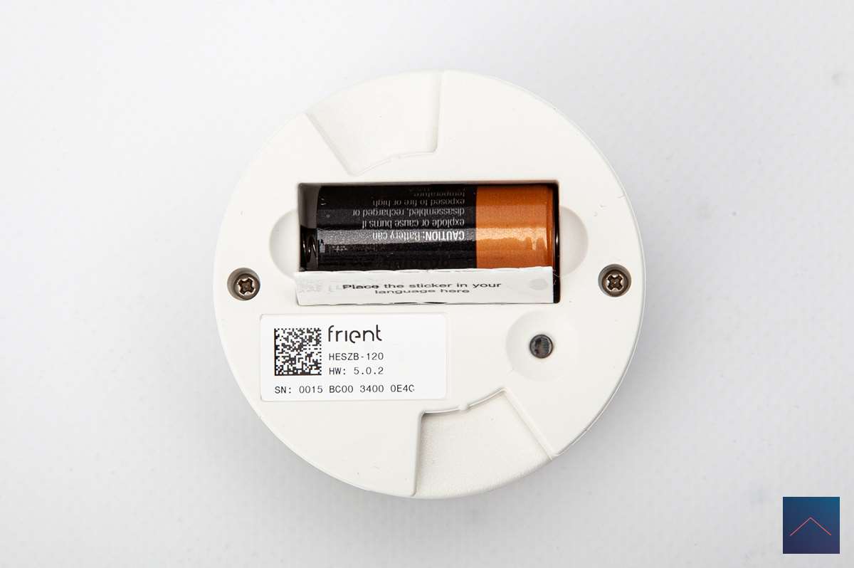 This product from Friend is distinguished by its size. Or actually because he's not big. It is only Ø 65 x 40 mm, which makes it one of the smallest on the market. At the bottom of the sensor is a bracket that you can attach to your ceiling. Screws are included for this. You then turn the sensor in this bracket so that the whole is securely fastened and you can easily access the battery later. The battery is a CR123A which is used in several Smart Home devices. According to Frient, the battery should last 5 years (if he sends a report every 5 minutes).