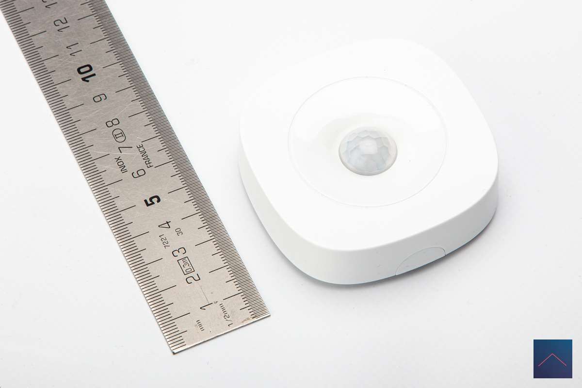 This motion sensor is 70 x 70 x 21 mm, which does not make it super compact, but you can still hang it invisibly. This hanging is easy thanks to the supplied bracket which you can attach with screws or the double-sided sticker. The motion detector automatically sticks to the bracket because it is magnetic. You can also put it down with another bracket.